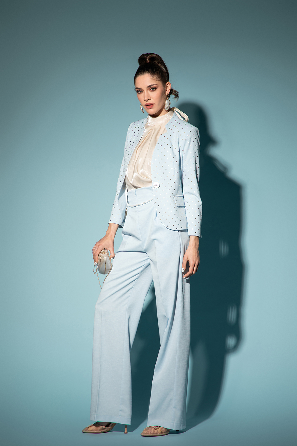 Стилен и елегантен панталон от приятна еластична материя в нежно светлосиньо. Вталена горна част с висока талия и чупки тип "paper bag", гайки и сваляща се бяла панделка. Леко свободен прав крачол с ръб. Закопчаване посредством цип отпред и интересни джобове. Перфектна комбинация със сако Majestic Fit-Azzure.