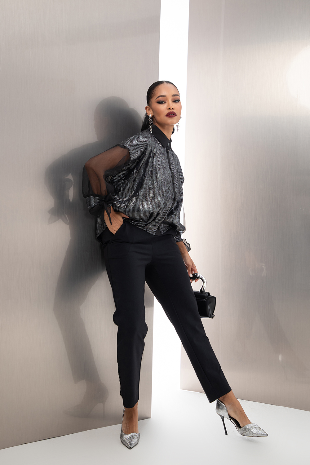 Елегантен панталон в черно от приятна силно еластична материя. Леко втален силует с ефектен завършек на крачола-триъгълна платка от дантела. Изчистена линия с колан ластик в задната част за по-голям комфорт, както и два джоба.