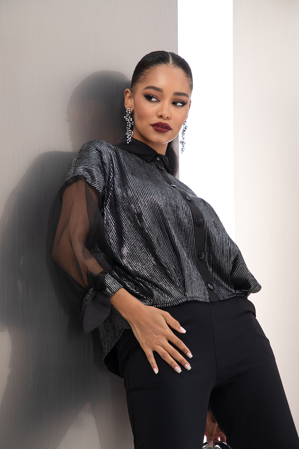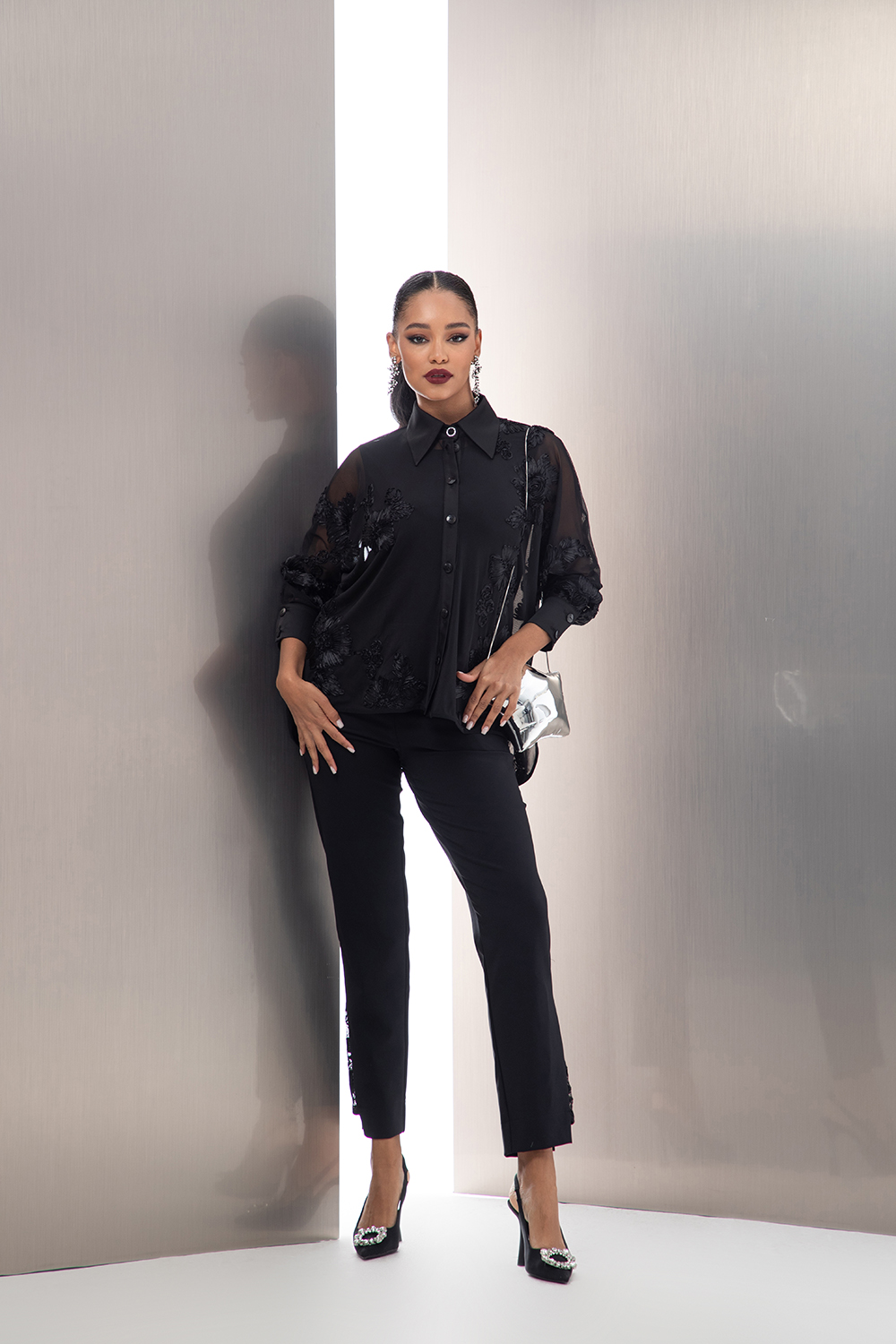 Елегантен панталон в черно от приятна силно еластична материя. Леко втален силует с ефектен завършек на крачола-триъгълна платка от дантела. Изчистена линия с колан ластик в задната част за по-голям комфорт, както и два джоба.