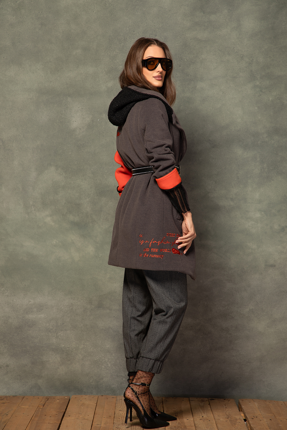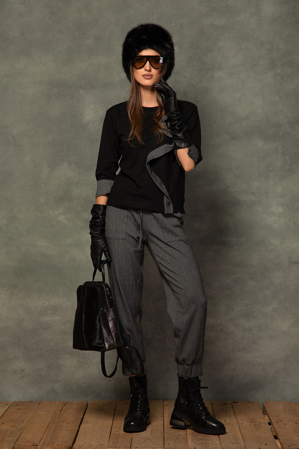 Елегантен панталон в сиво с дискретно райе от приятна еластична материя. Леко свободна кройка с колан ластик и връзка в талията и маншет с ластик на крачола. Два предни джоба.