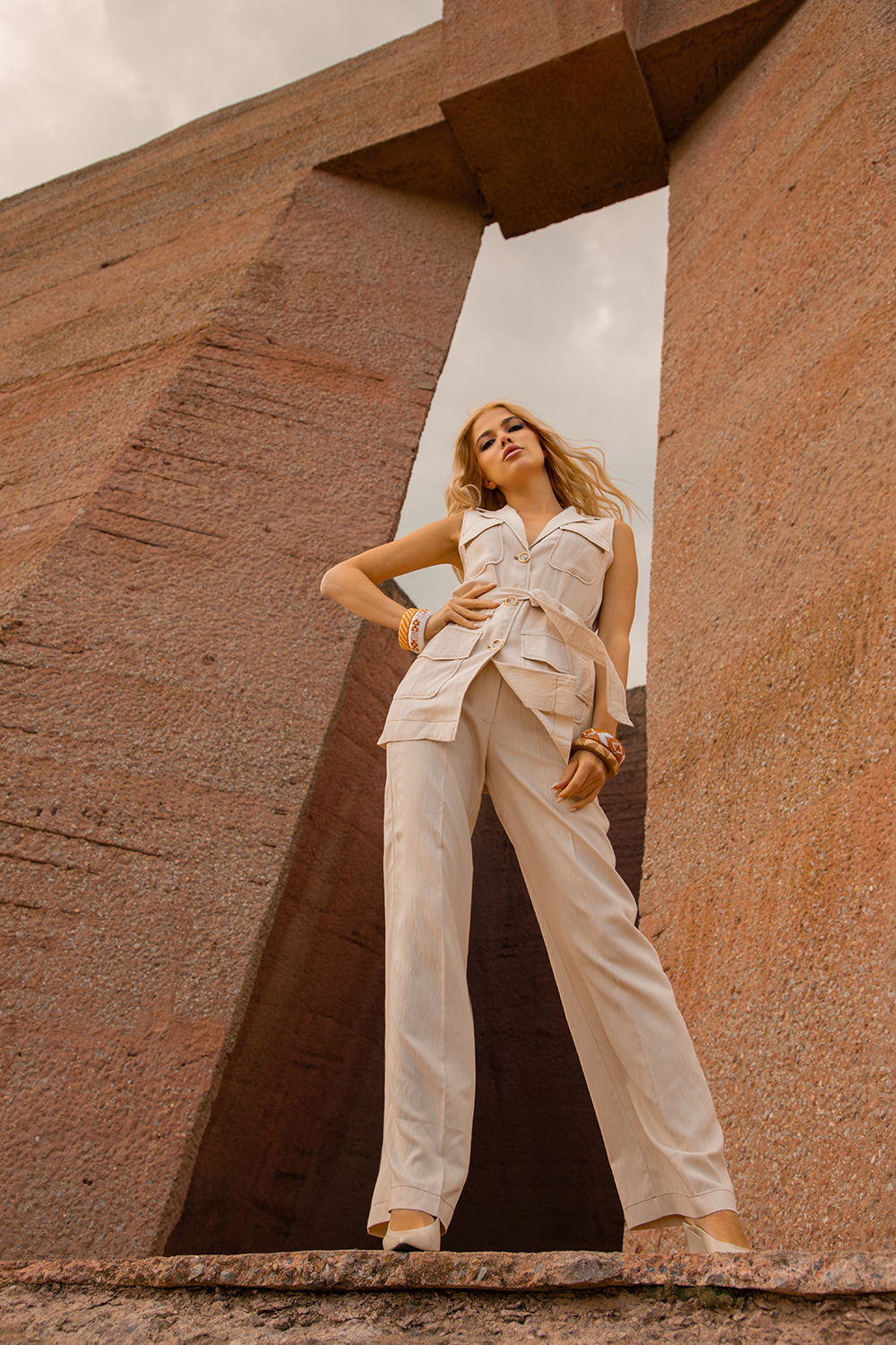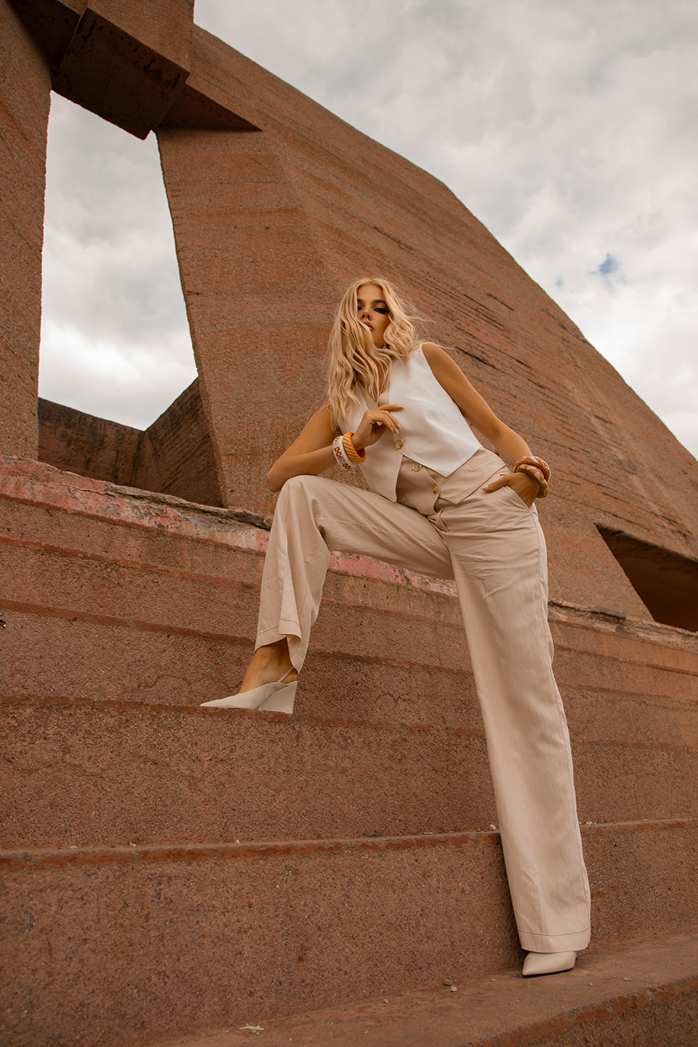 Спортно-елегантен панталон от приятна материя смес от лен и вискоза в светло бежово. Стилна изчистена линия с широк крачол с ръб. Колан с ластик в задната част и гайки. Закопчаване посредством цип и копче, два предни джоба.