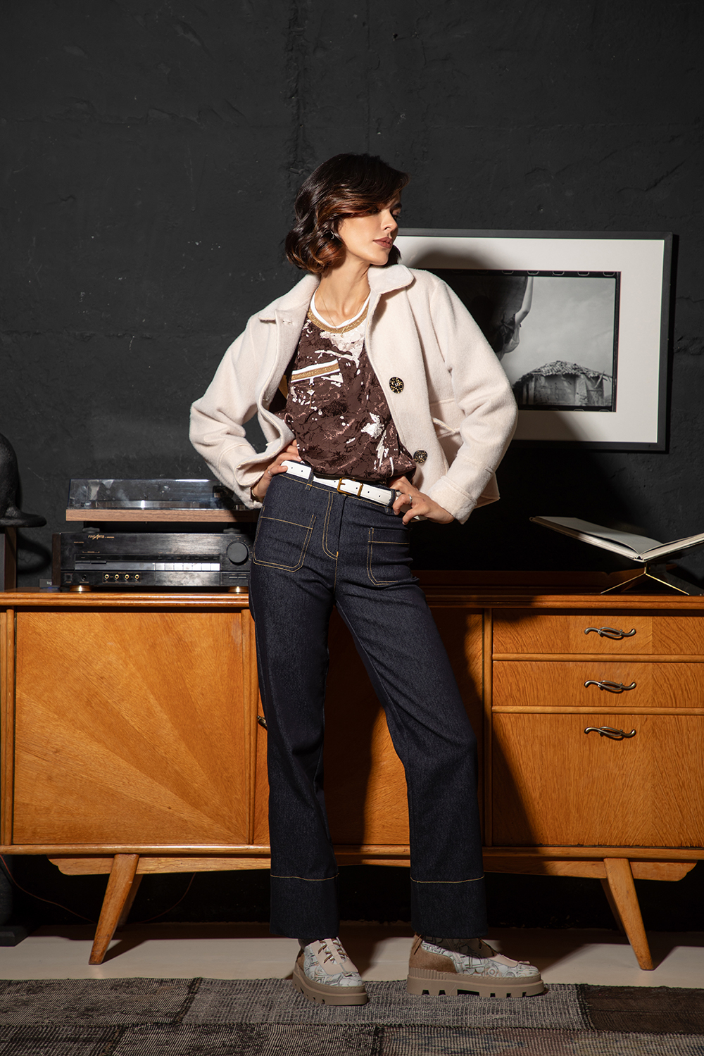 Спортно-елегантен панталон изработен от приятен деним с високо съдържание на памук в цвят индиго. Стилна, леко вталена линия с разкроен крачол широк маншет. Предни и задни външни джобове и гайки за колан. Закопчаване посредством цип и копче отпред.