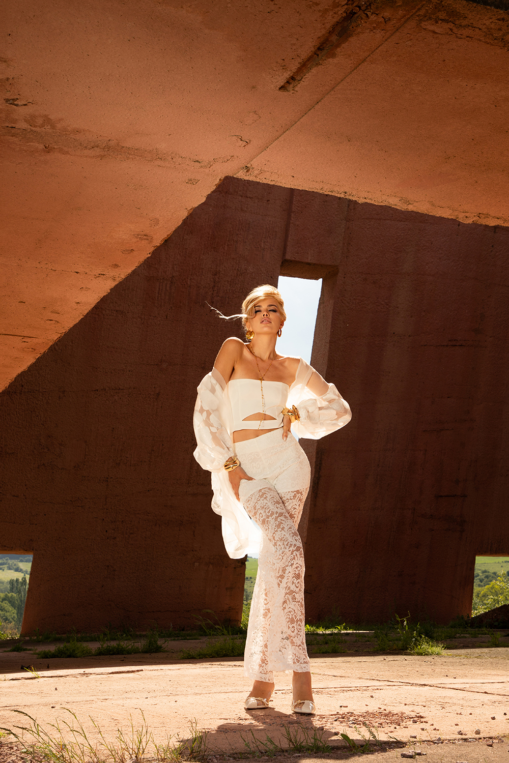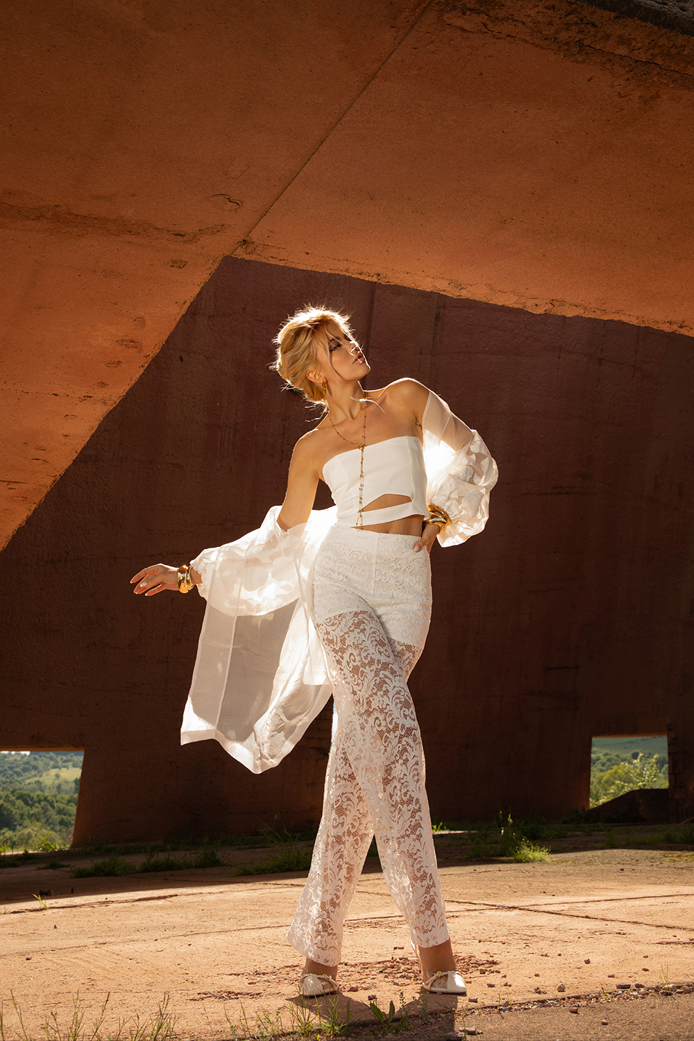 Елегантен панталон от изящна дантела в бяло. Втален силует с леко свободен крачол. Изчистена линия със задно закопчававне посредством скрит цип. Панталона е изработен с вътрешна подплата къс панталон от приятна материя в бяло. Перфектна комбинация със сако Super Nova.