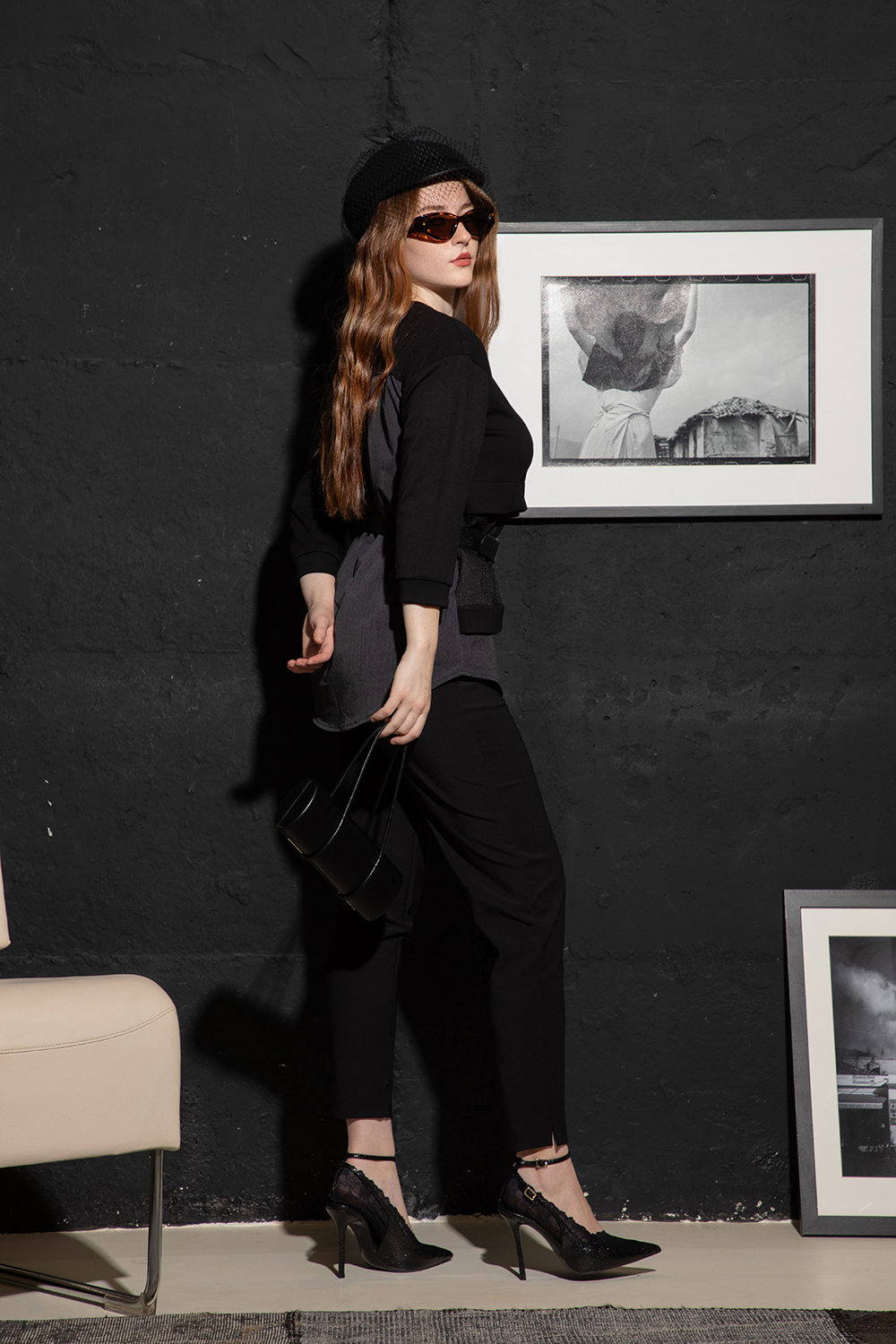 Спортно-елегантен панталон в черно. Изработен от приятна силно еластична материя. Леко вталена линия, странични джобове с декоративни копчета. За по-голям комфорт има ластик в задната част на талията.