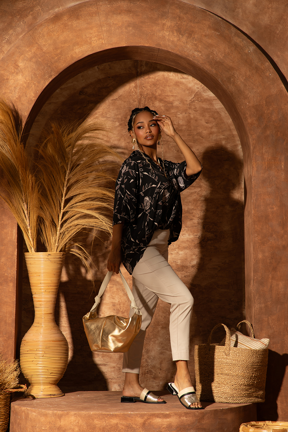 Спортно-елегантен панталон в светло бежово. Изработен от приятна силно еластична материя. Леко вталена линия, странични джобове с декоративни копчета. За по-голям комфорт има ластик в задната част на талията.