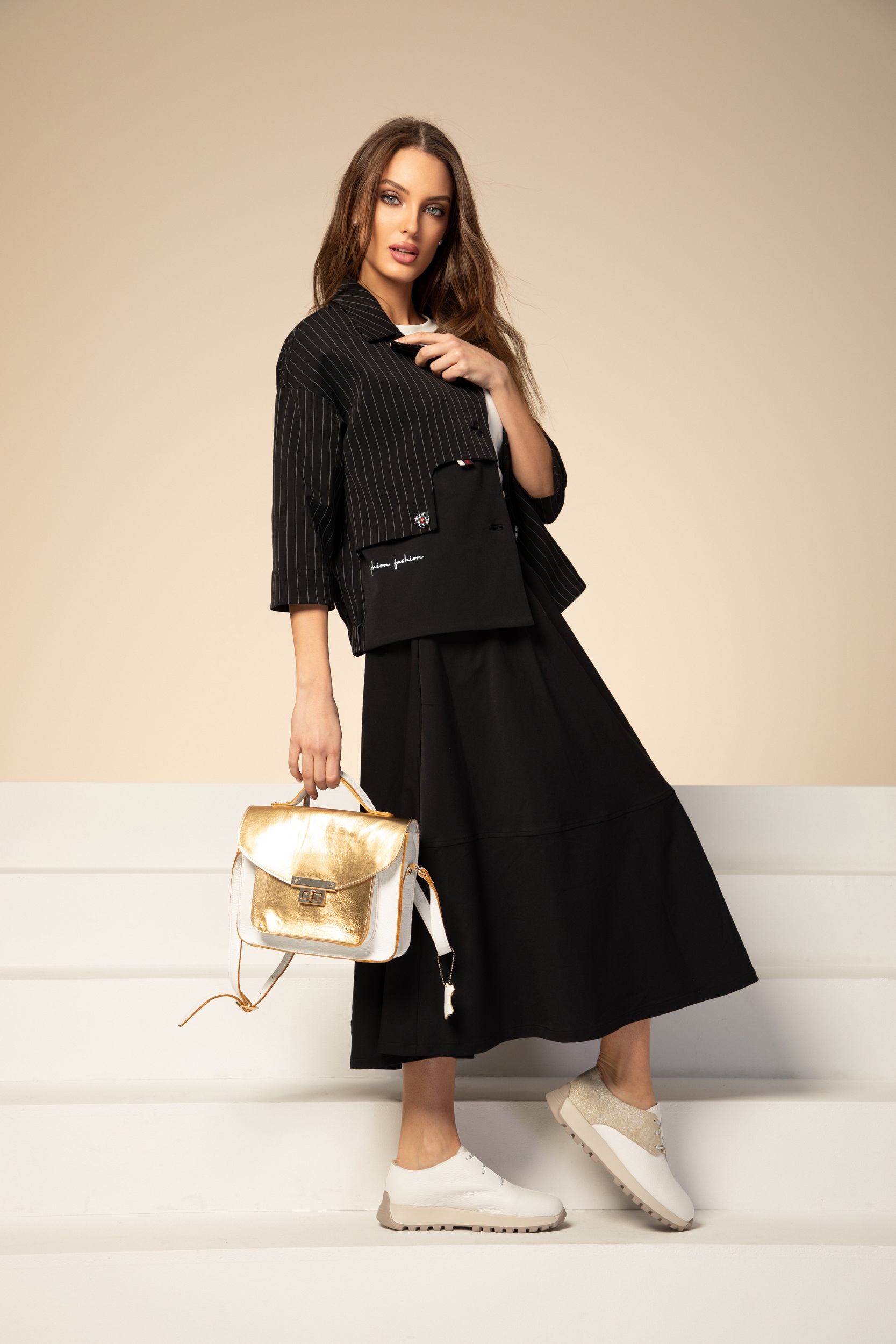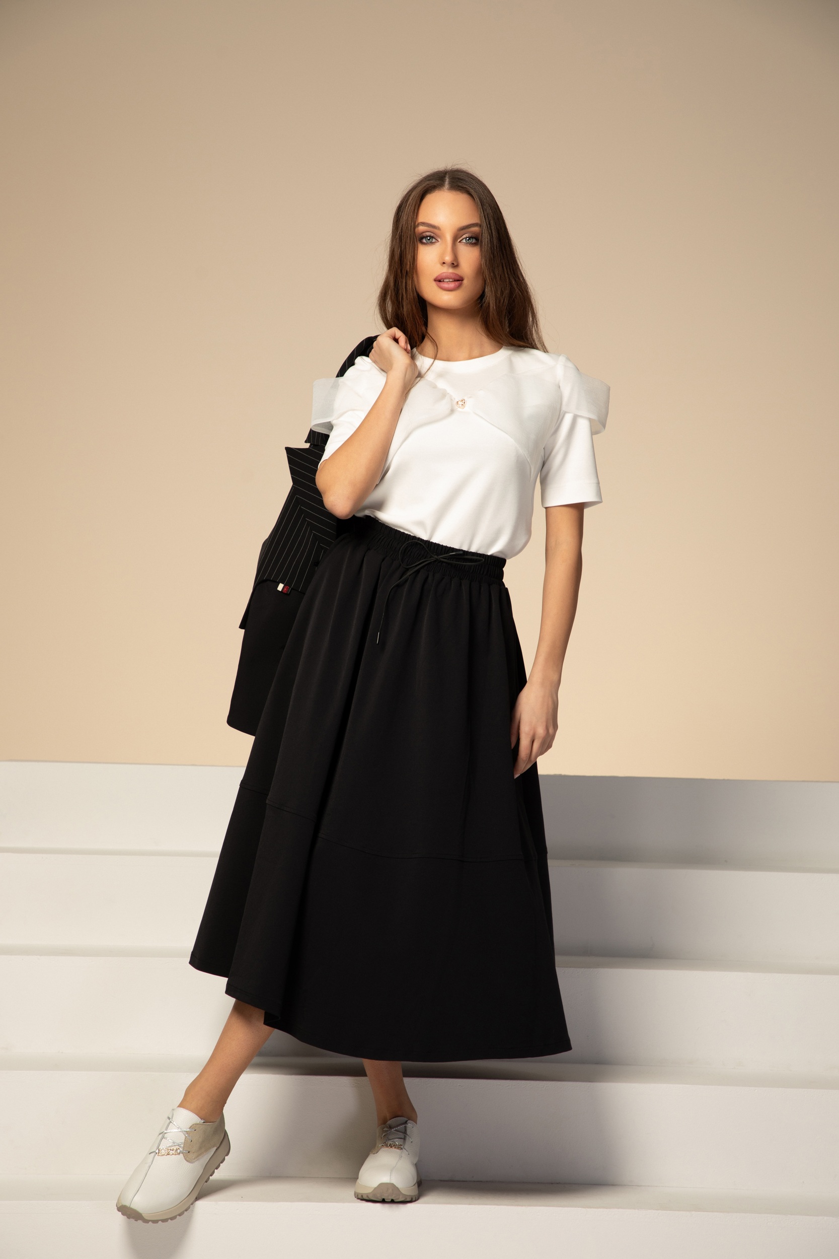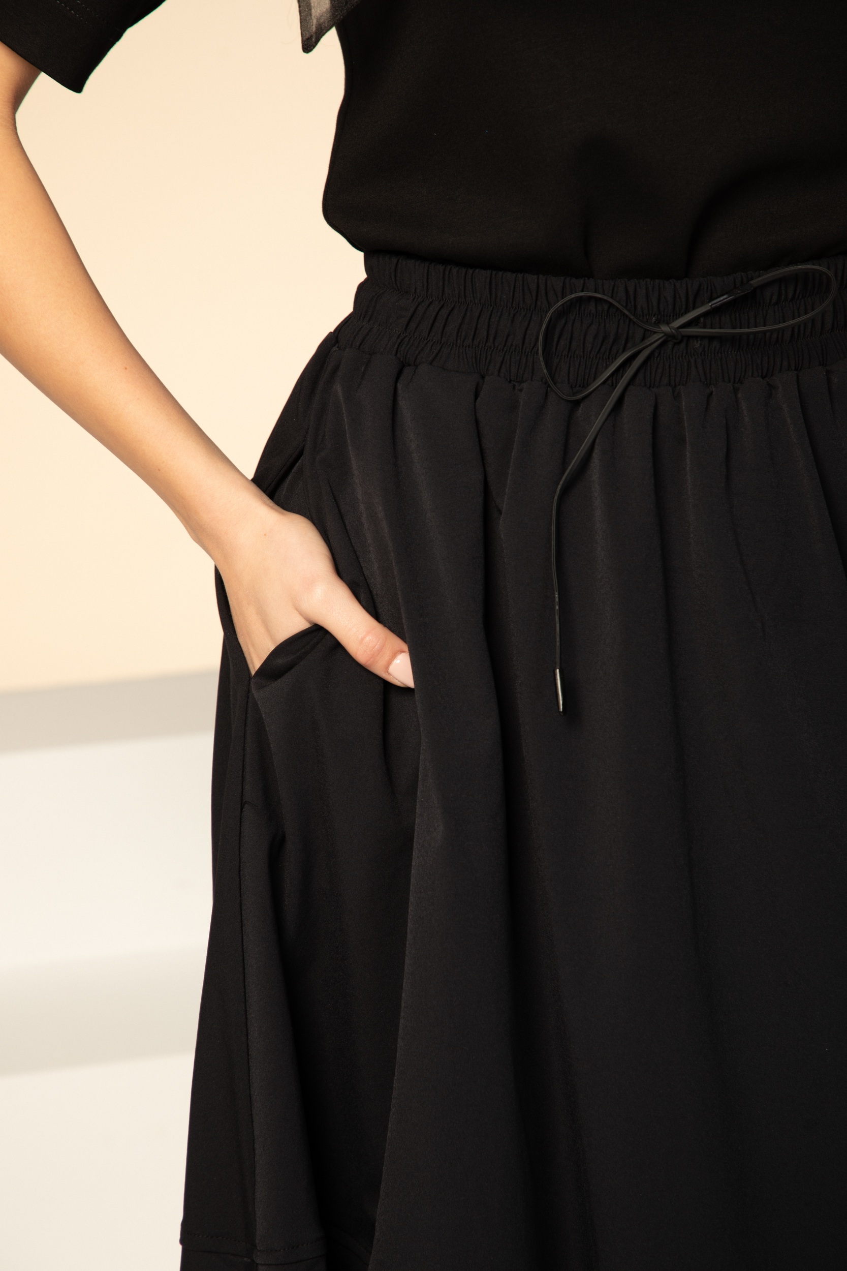 Спортно-елегантна пола в черно от приятна еластична материя. Свободна клоширана кройка и миди дължина. За по-голям комфорт колан ластик в талията с регулируема връзка и два странични джоба.