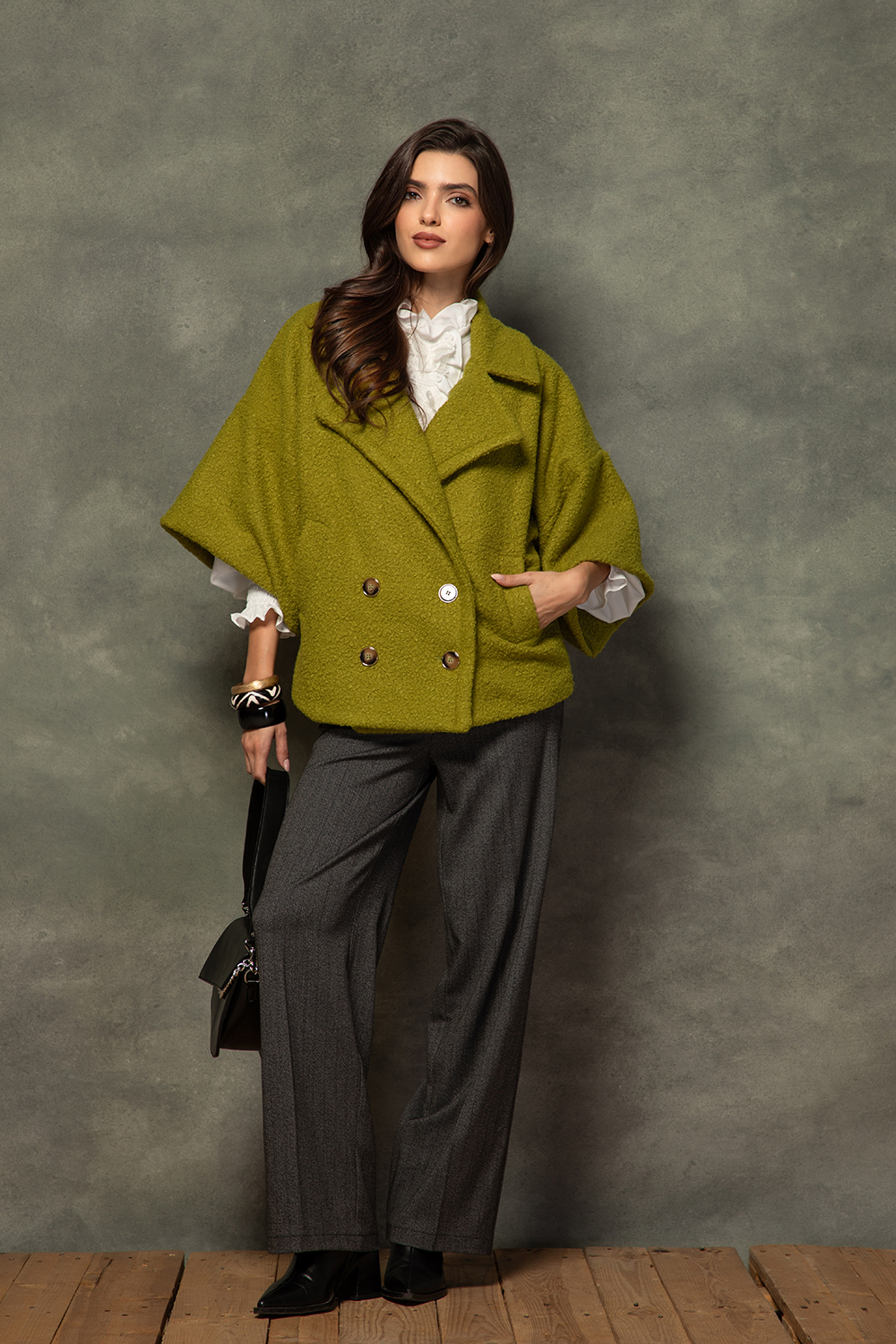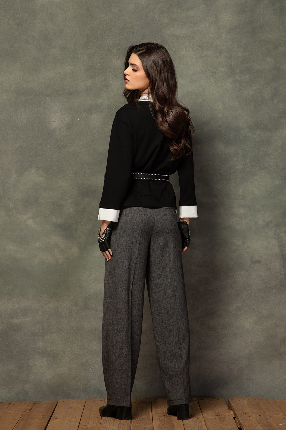 Елегантен панталон в сиво от приятна еластична материя. Леко свободен силует с прав крачол. Ефектен двоен ластичен колан в черно и странични джобове.