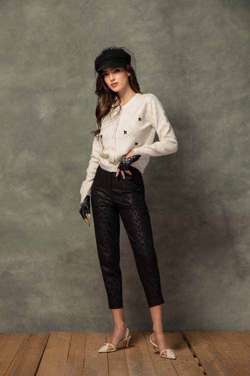 Елегантен панталон в черно от приятна еластична материя. Класически прав силует с гладен ръб на крачола. Предно закопчаване посредством цип и копче. Колан ластик в задната част на талията и двойни гайки за колан.