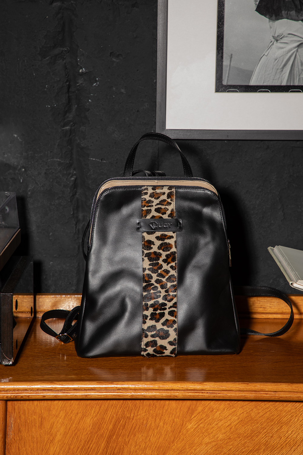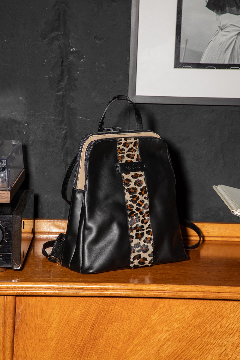 Елегантна раница в черно и ефектен анималистичен принт от висококачествена естествена кожа. Две големи отделения с цип. В първото отделение има малко джобче без цип, а във второто вътрешен и външен джоб с цип. Презрамките са с регулируема дължина.