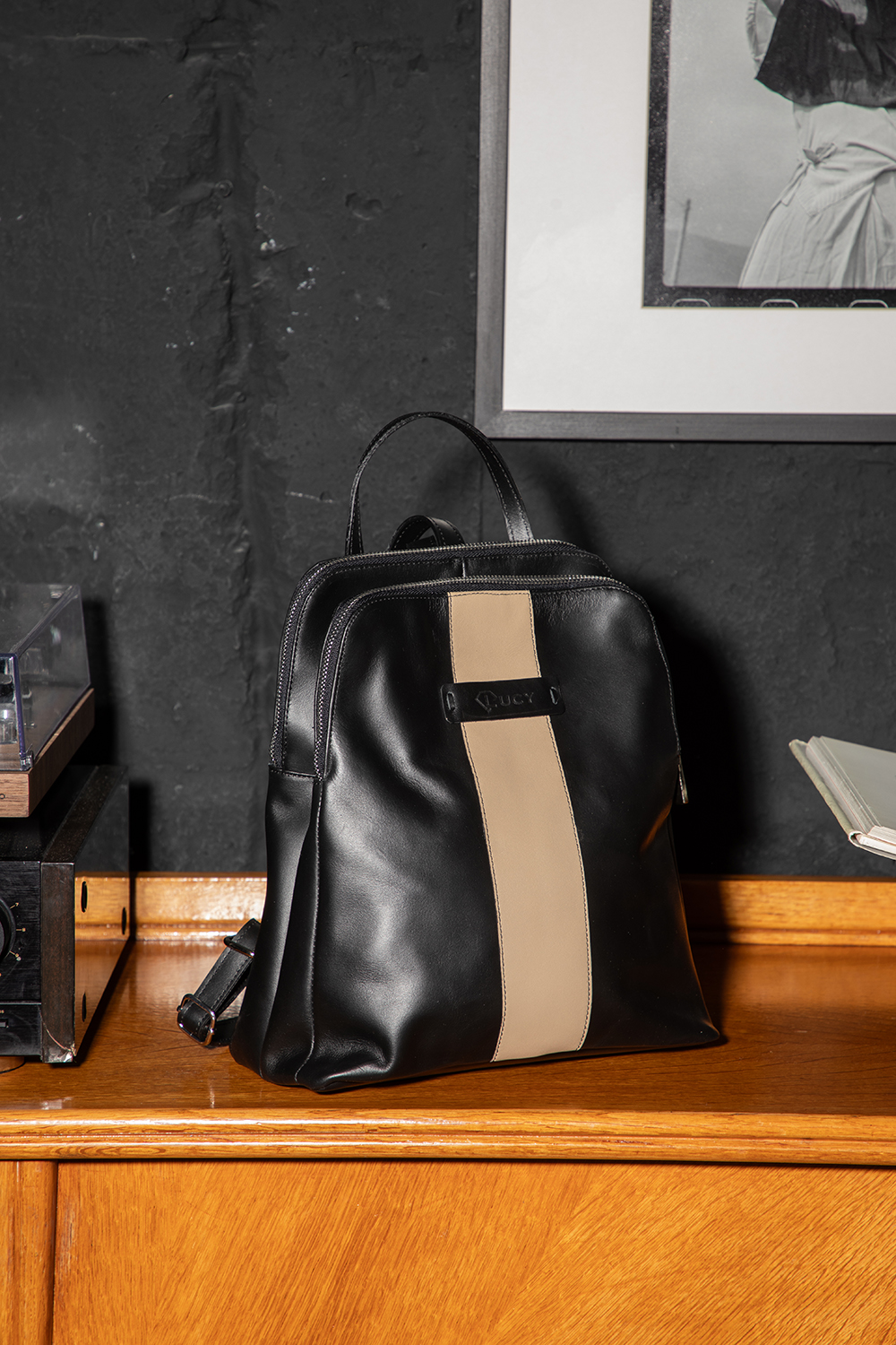 Елегантна раница в черно и цвят крем от висококачествена естествена кожа. Две големи отделения с цип. В първото отделение има малко джобче без цип, а във второто вътрешен и външен джоб с цип. Презрамките са с регулируема дължина.