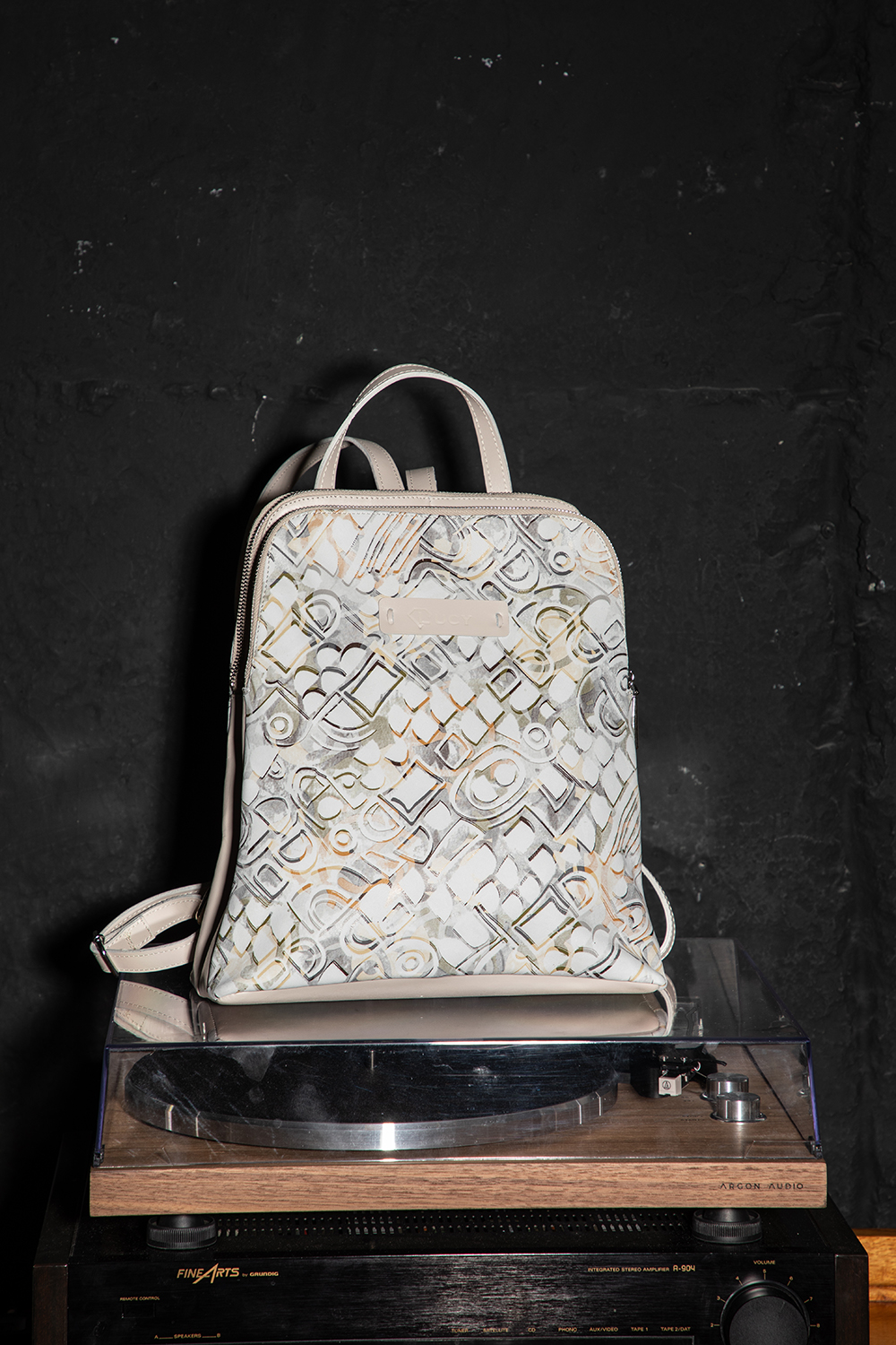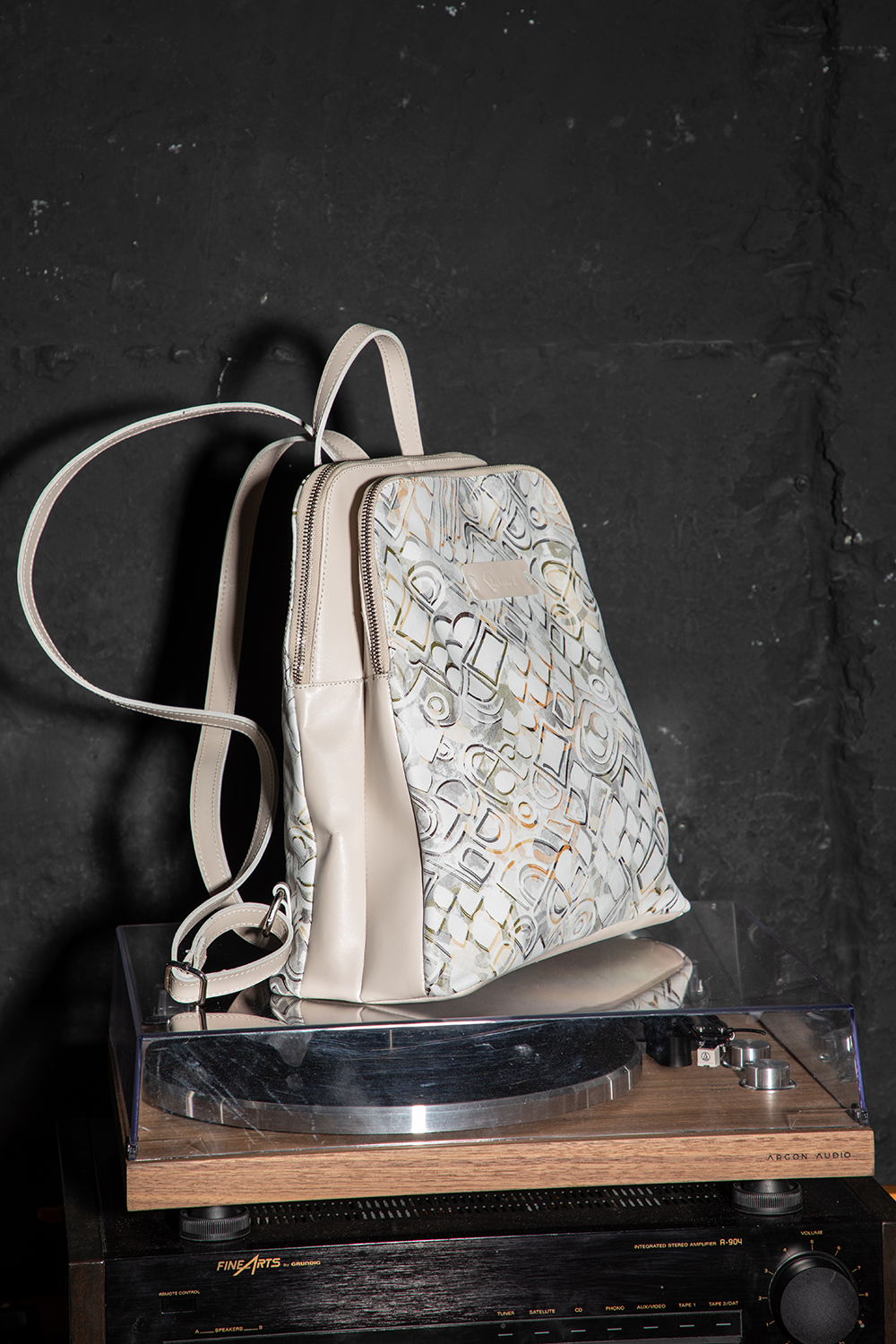 Елегантна раница в цвят крем с ефектен принт от висококачествена естествена кожа. Две големи отделения с цип. В първото отделение има малко джобче без цип, а във второто вътрешен и външен джоб с цип. Презрамките са с регулируема дължина.