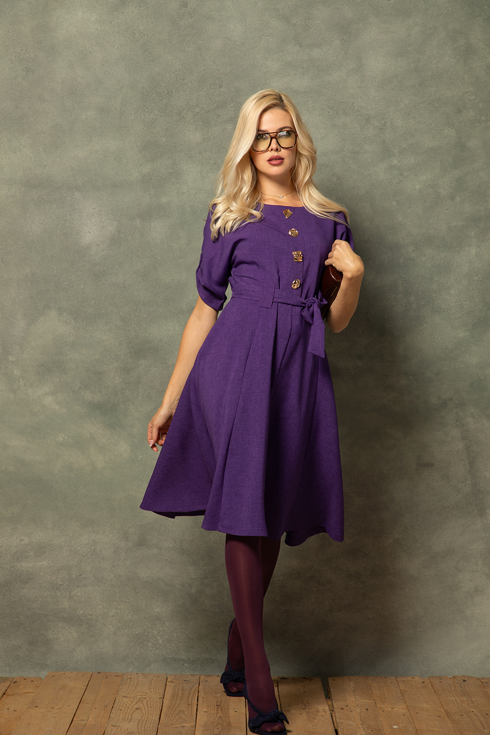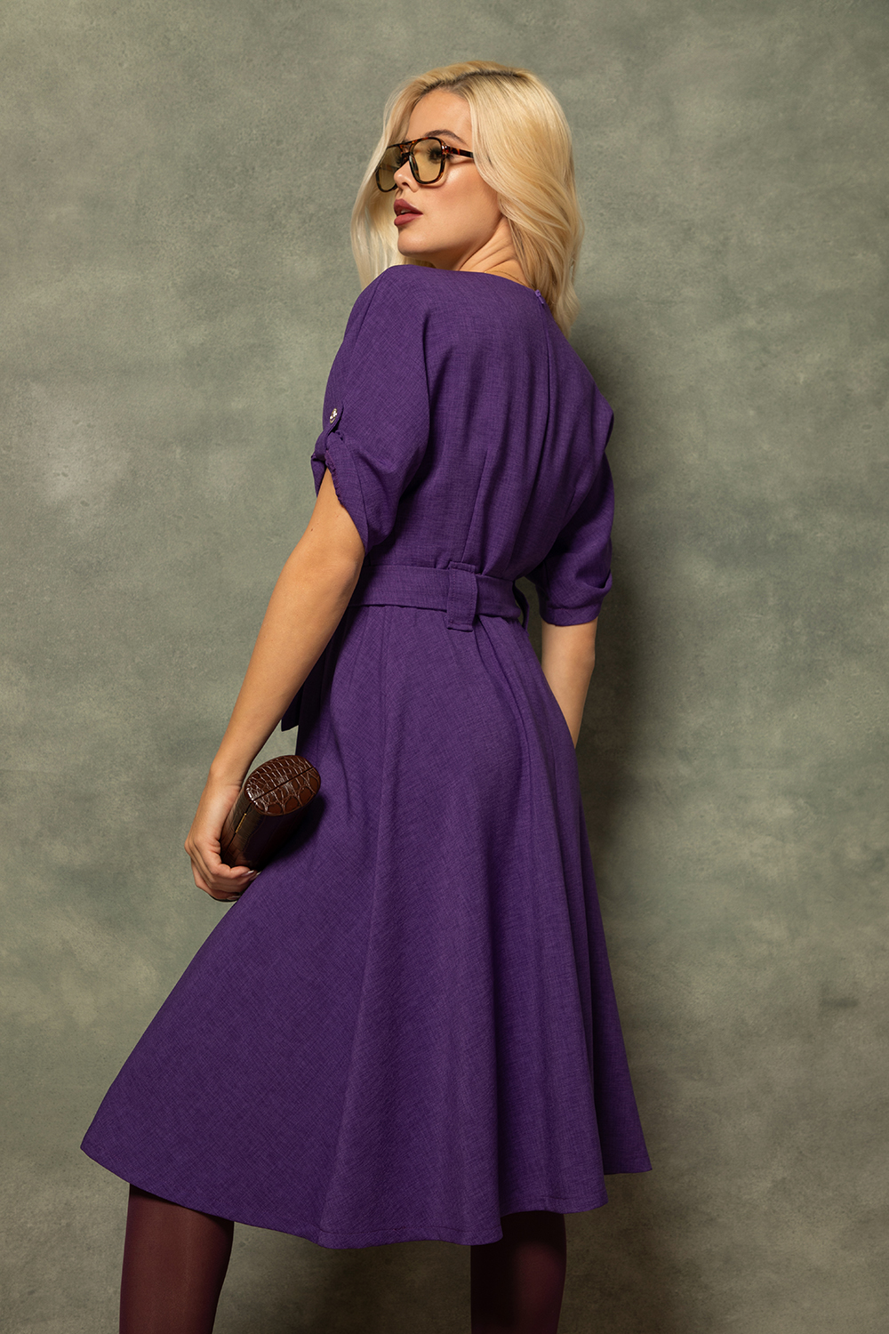 Елегантна рокля в миди дължина. Моделът е изработен от приятна материя със съдържание на вискоза в лилаво. Разкроен силует с вталяване посредством подвижен колан-пандела и гайки. 7/8 ръкав с щрифелка. Овално деколте и декоративни копчета отпред. Закопчаване посредством цип на гърба.