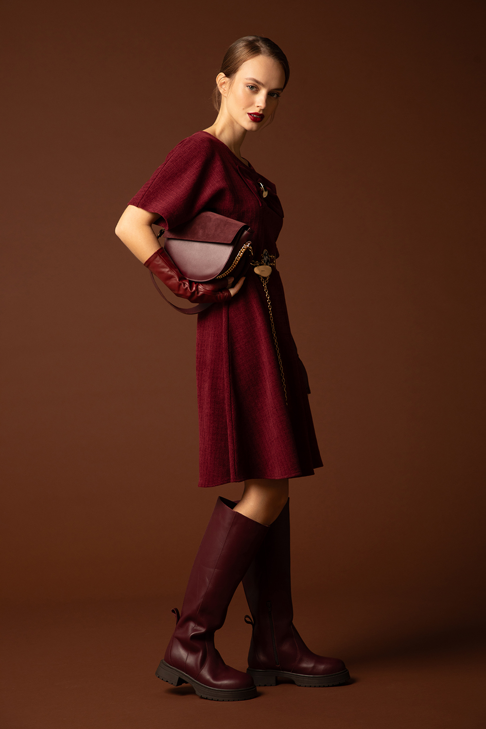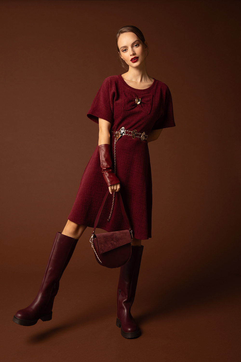 Елегантна рокля в бордо от приятна еластична материя. Леко втален А-силует с 3/4 свободен прилеп ръкав. Обло деколте и декоративна пандела със златисто бижу на предницата. Закопчаване посредством скрит цип на гърба.