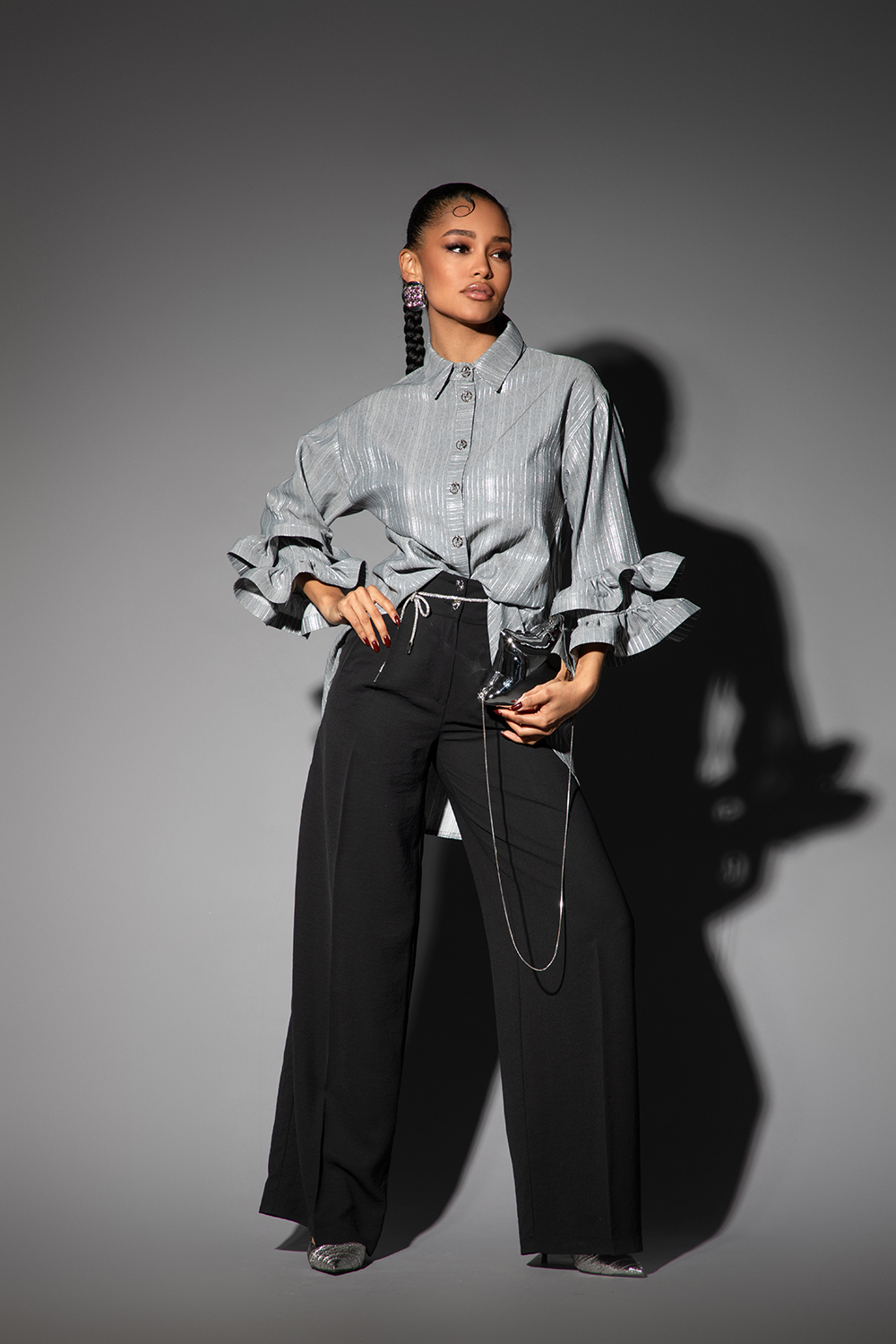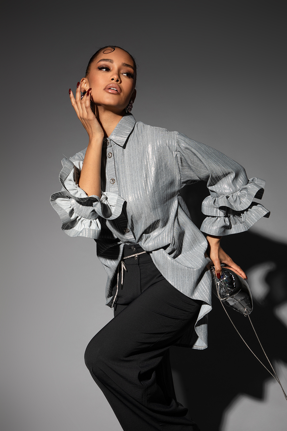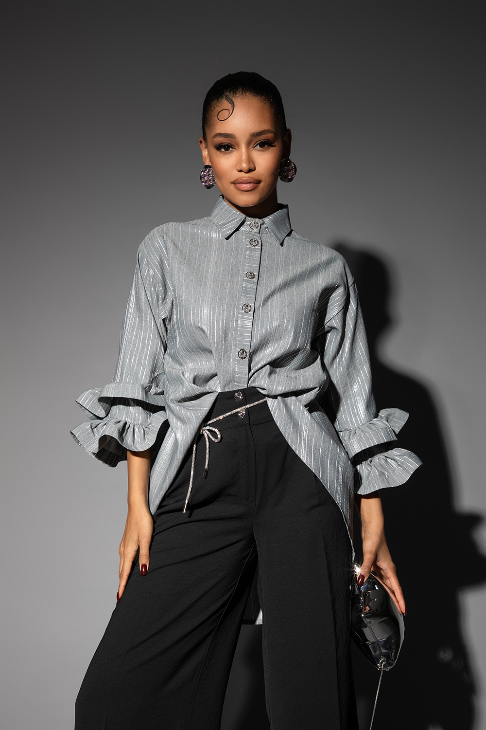 Елегантна бяла риза от приятна вискоза в сиво със дискретна сребриста нишка. Свободна кройка с издължен, леко разкроен гръб. Ефектни ръкави с разкошни волани. Закопчаване посредством пластрон с копчета и яка.