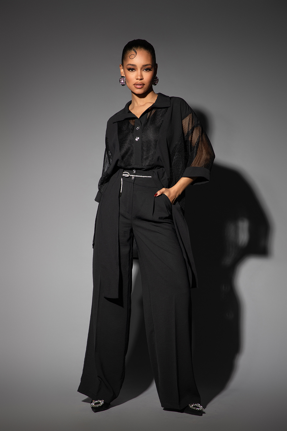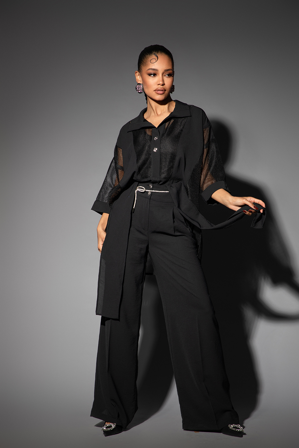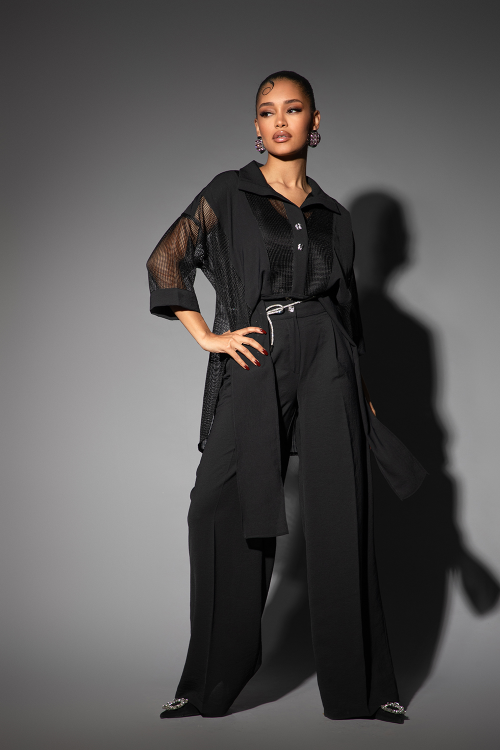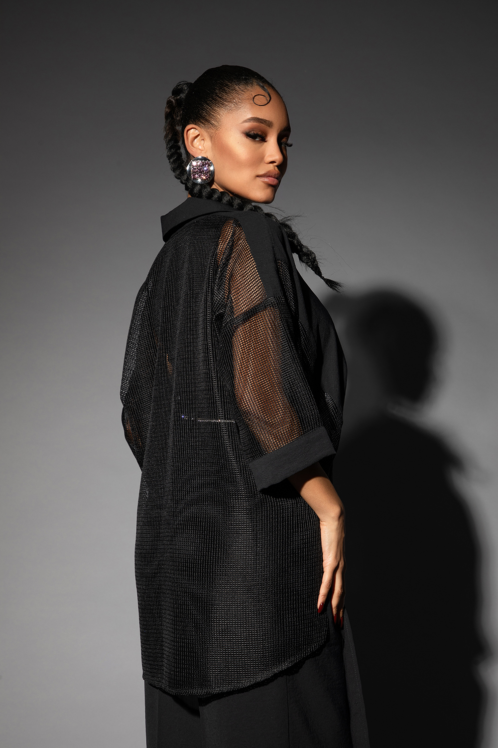 Елегантна риза комбинация от фина мрежа и приятна материя в черно. Доста свободна линия с асиметричен раздвижен подгъв и издължен гръб. Закопчаване посредством шлиц с две копчета и яка. 7/8 широк ръкав завършен с маншет. Ризата е с отделна подплата от еластична материя тип топ с презрамки.