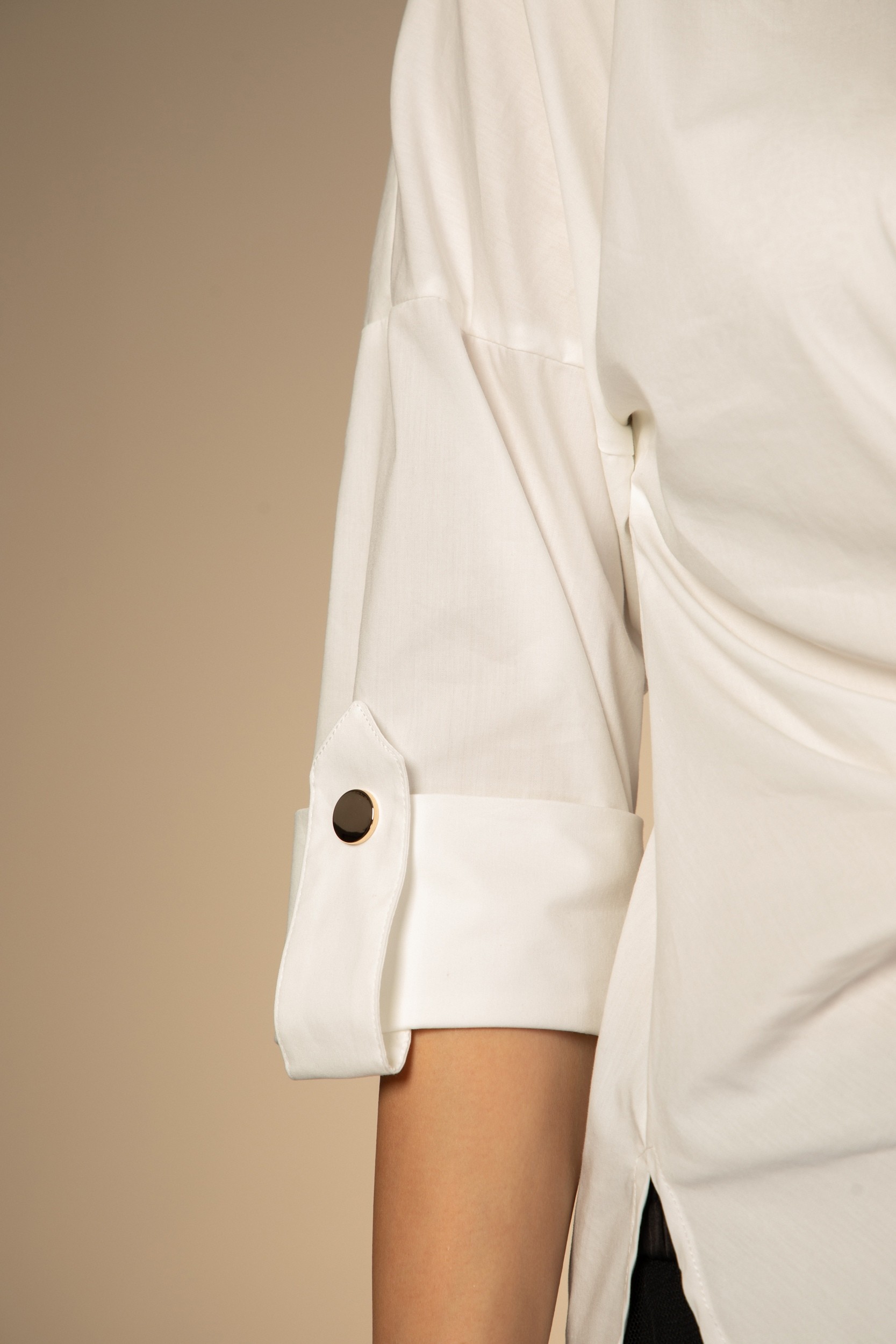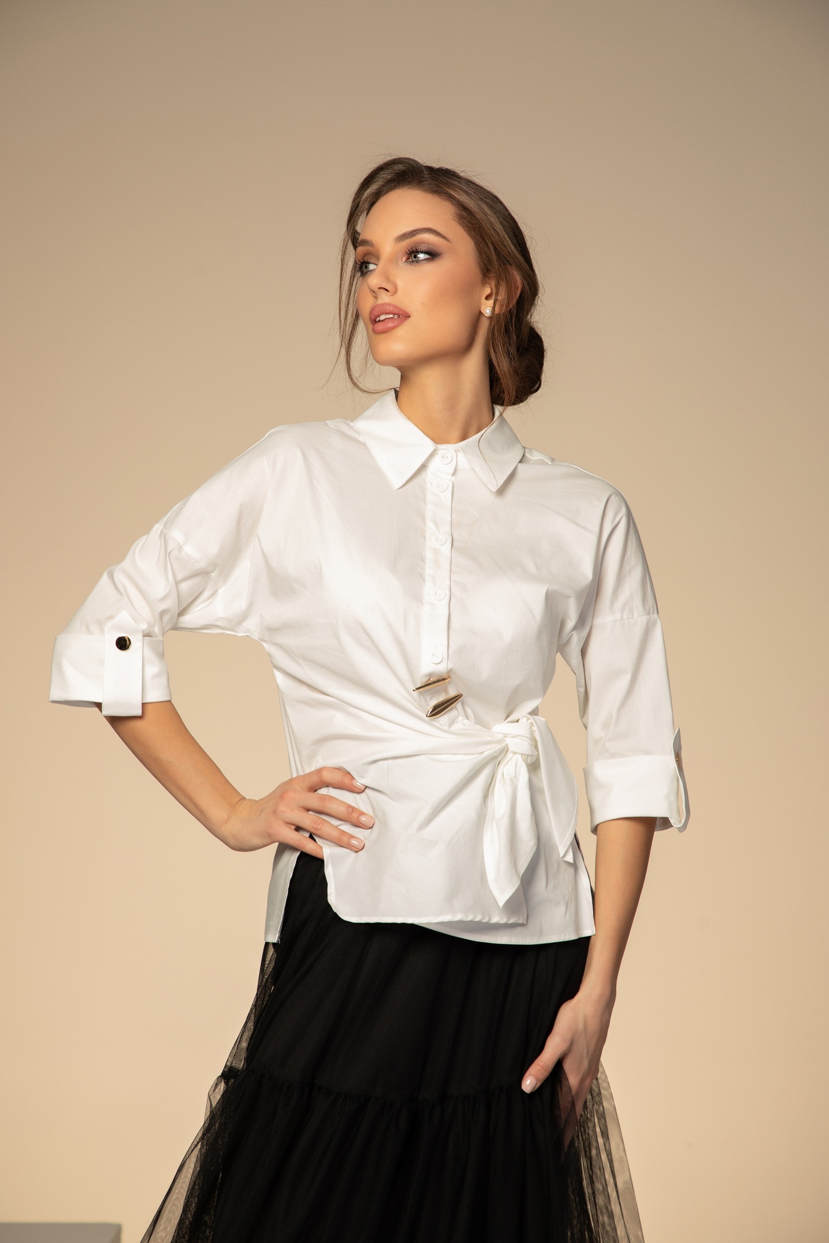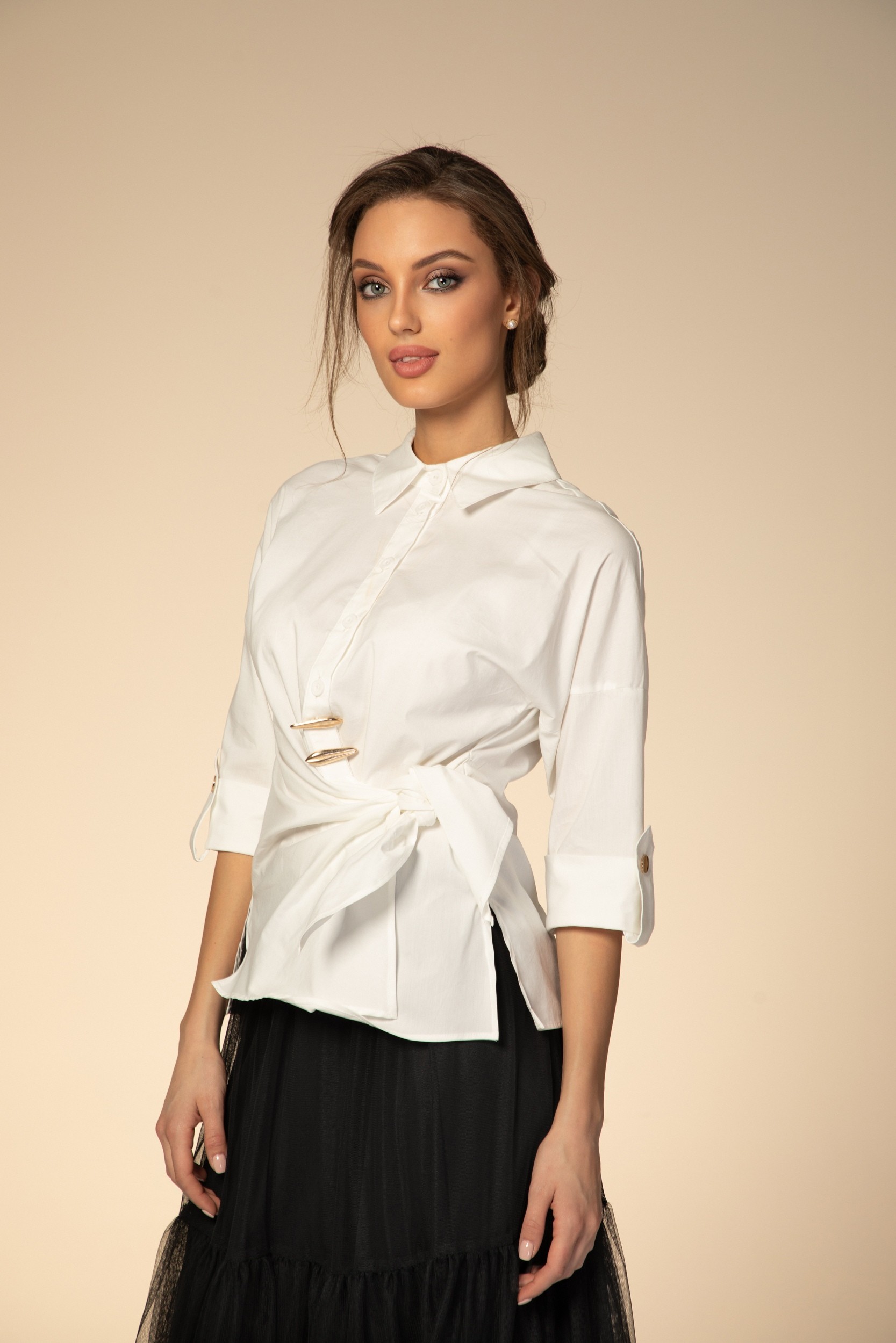 Елегантна риза от приятна еластична материя с високо съдържание на памук в бяло. Леко втален силует с интересно асиметрично връзване в предната част и две златисти декоративни копчета. Закопчаване посредством пластрон с копчета и яка. 7/8 ръкав с маншет и щрифелка, цепки встрани.