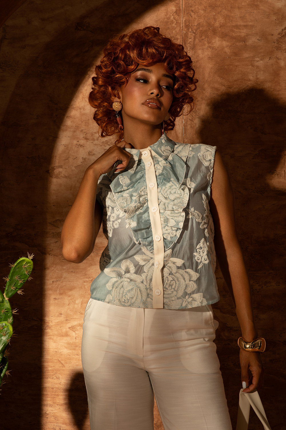 Елегантна блуза от ефектна материя в светло синьо с бродирани флорални мотиви. Леко втален силует с предно закопчаване посредством копчета. Яка и къдри в предната част.