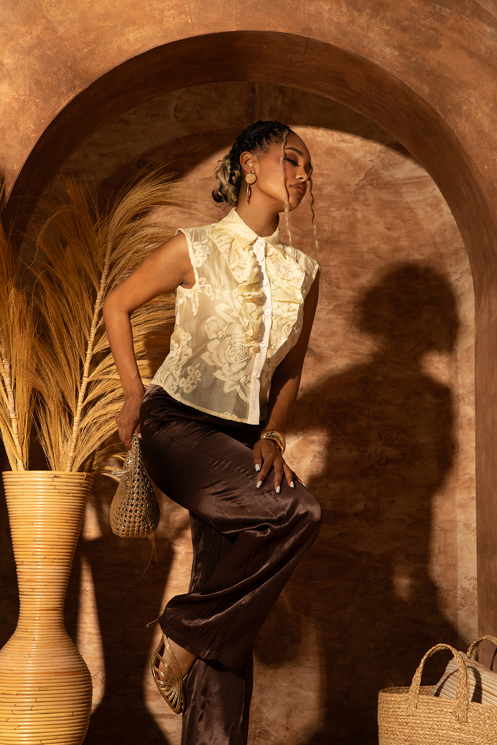 Елегантна блуза от ефектна материя в бледо жълто с бродирани флорални мотиви. Леко втален силует с предно закопчаване посредством копчета. Яка и къдри в предната част.