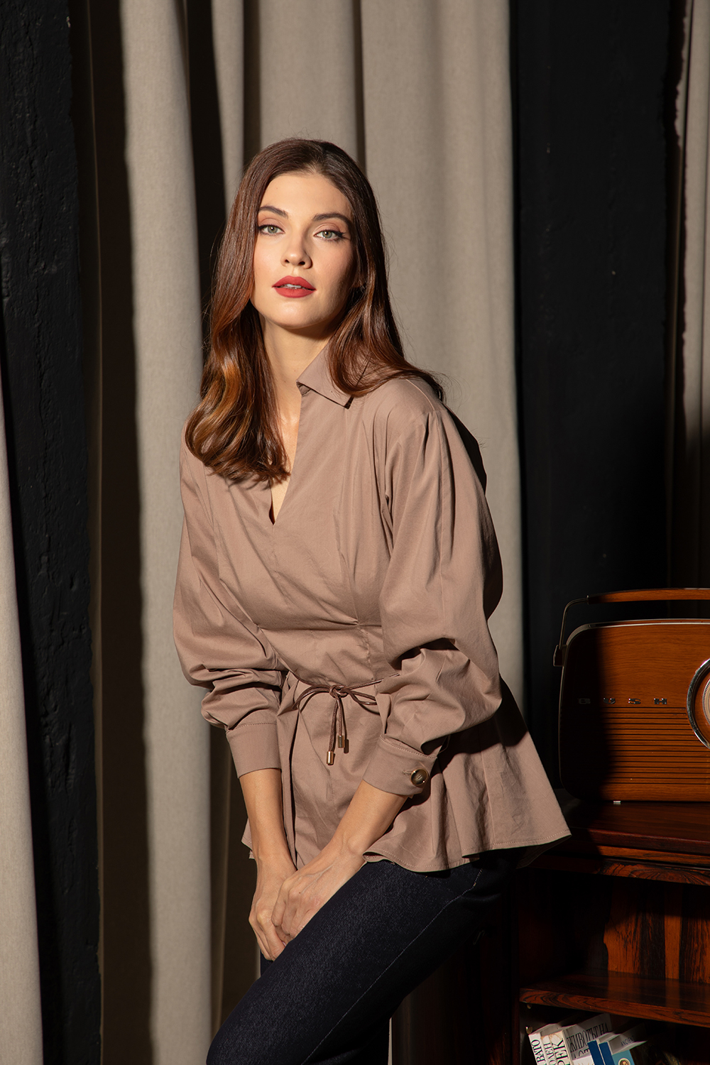 Елегантна риза в цвят капучино от приятна еластична материя с високо съдържание на памук. Леко свободна линия с вталяване посредством плохи. Стилно V-образно деколте и яка, дълъг ръкав с маншет. Ризата се предлага с тънка връзка като коланче.