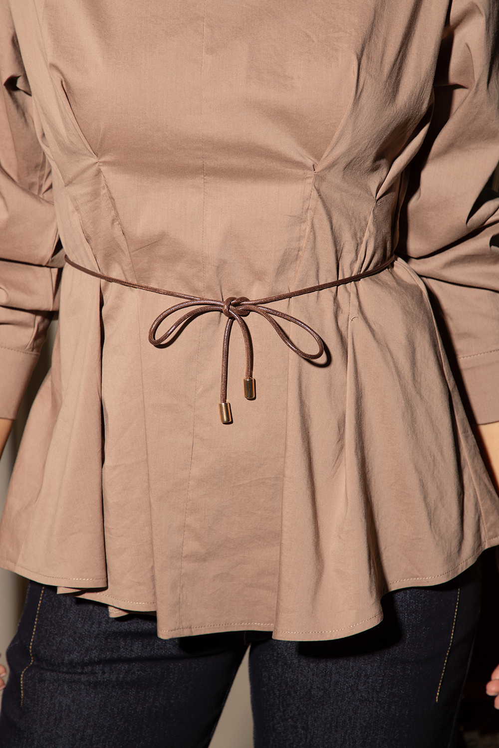 Елегантна риза в цвят капучино от приятна еластична материя с високо съдържание на памук. Леко свободна линия с вталяване посредством плохи. Стилно V-образно деколте и яка, дълъг ръкав с маншет. Ризата се предлага с тънка връзка като коланче.