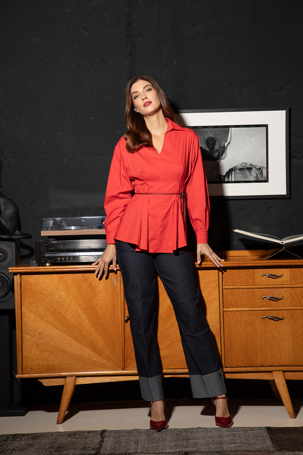 Елегантна риза в светло червено от приятна еластична материя с високо съдържание на памук. Леко свободна линия с вталяване посредством плохи. Стилно V-образно деколте и яка, дълъг ръкав с маншет. Ризата се предлага с тънка връзка като коланче.