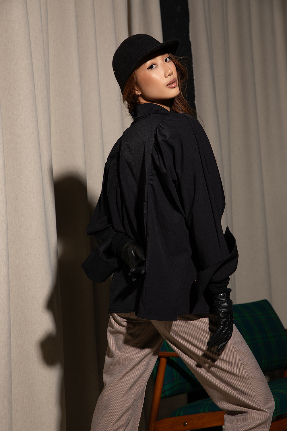 Елегантна риза от силно еластична материя в наситено черно. Вталена линия с богат ръкав с набор тип прилеп и маншет. Закопчаване посредством пластрон с копчета и яка.