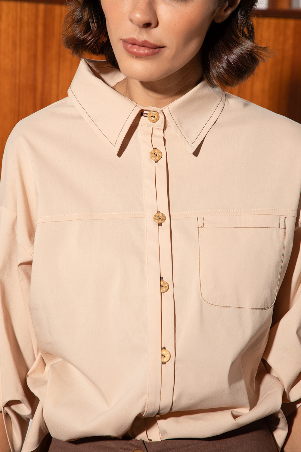 Спортно-елегантна риза от приятна еластична материя с високо съдържание на памук в топло бежово. Свободен силует с издължена предна част. Интересно закопчаване отпред, посредством пластрон с копчета и яка. Преден джоб и 7/8 ръкав с маншет и щрифелка.