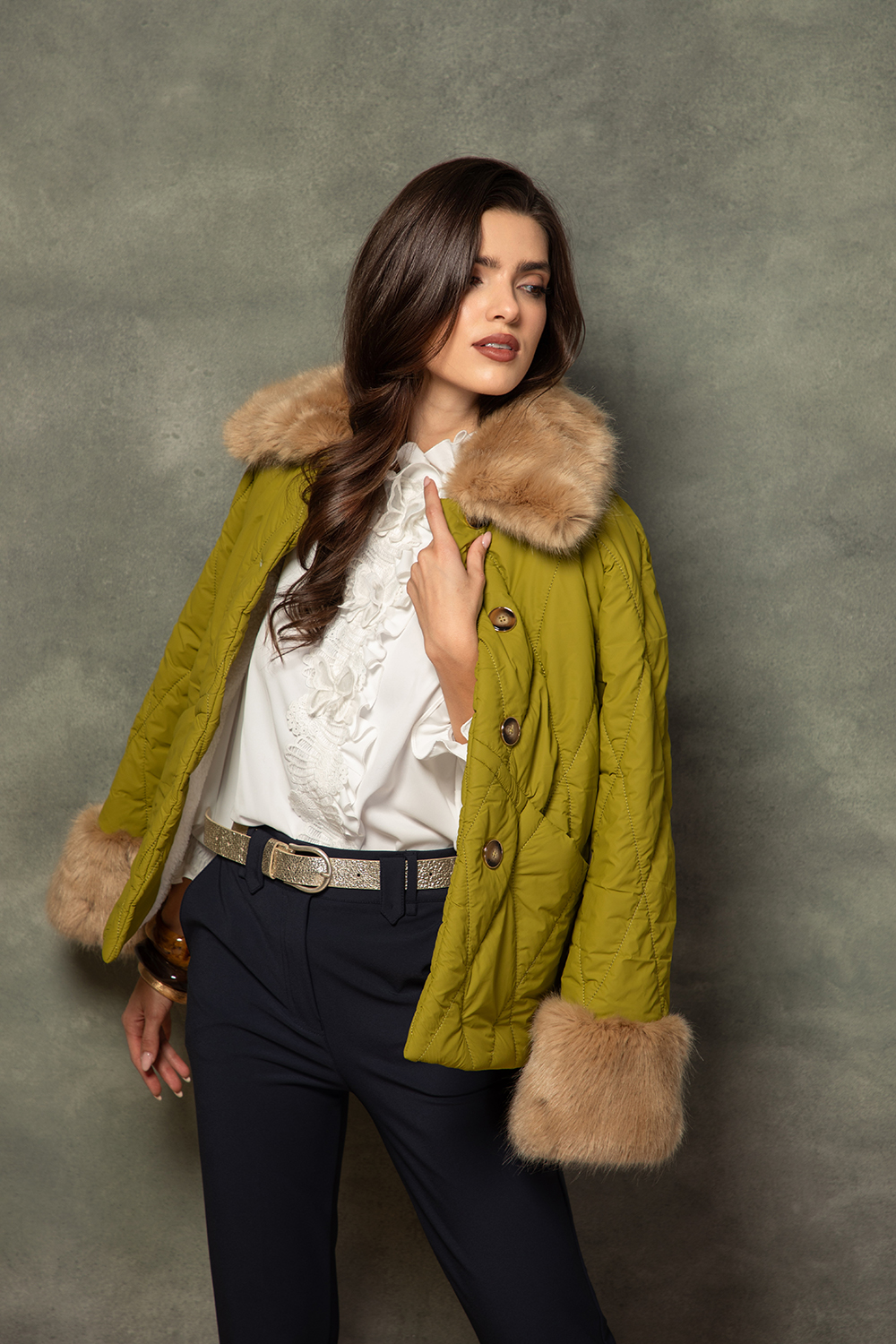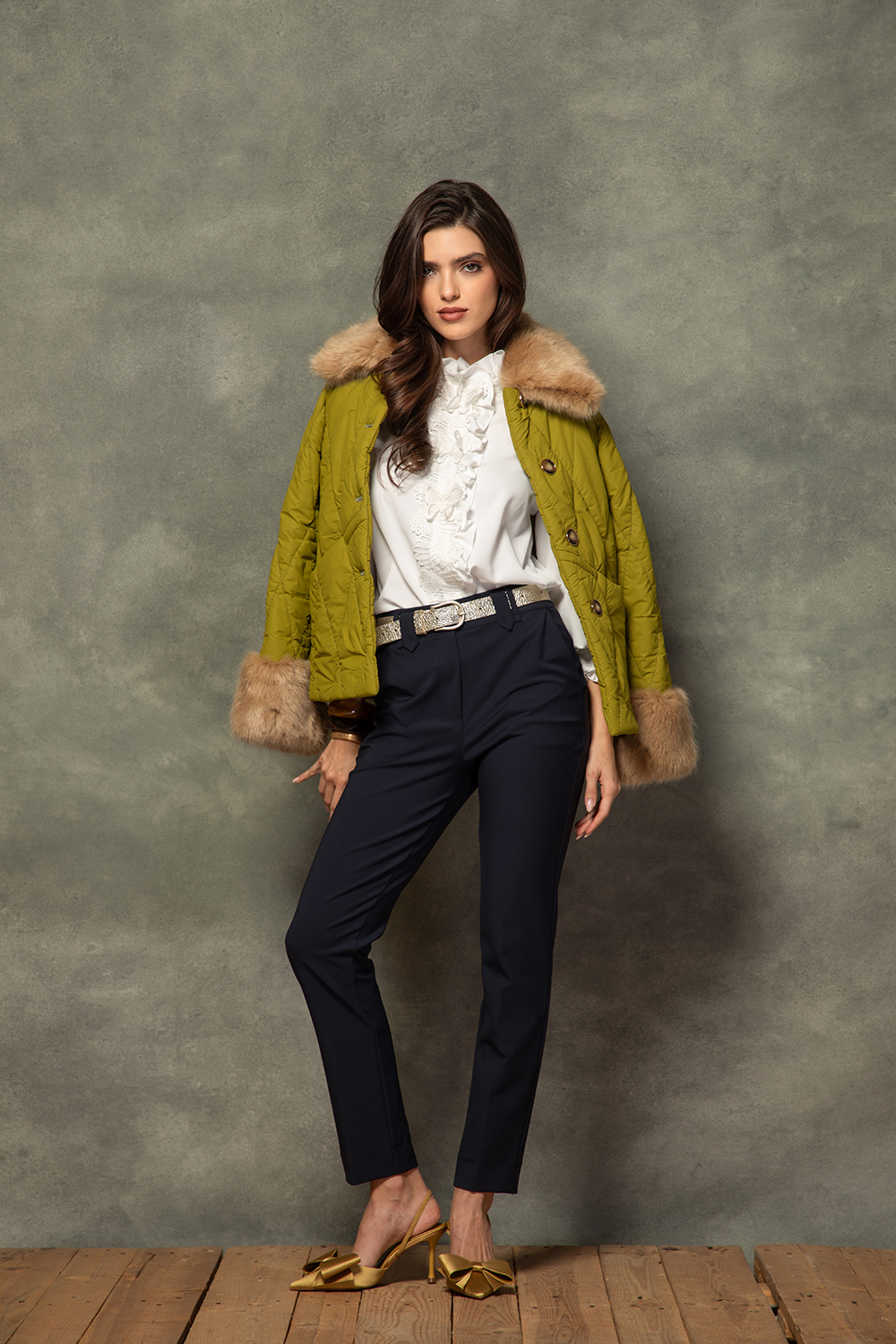 Елегантна риза от приятна материя в бяло. Леко свободен силует с ефектни къдри и дантела на предницата. Предно закопчаване с копчета, яка и маншети с нежни къдри.