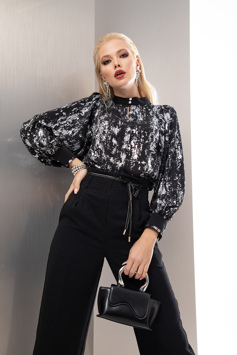 Елегантна риза с ефектен сребрист принт от лек шифон. Свободен силует с декоративен пластрон на предницата. Обла столче яка с предно закопчаване посредством две малки копченца и цепка. Дълъг обемен ръкав, завършен с маншет в черно.