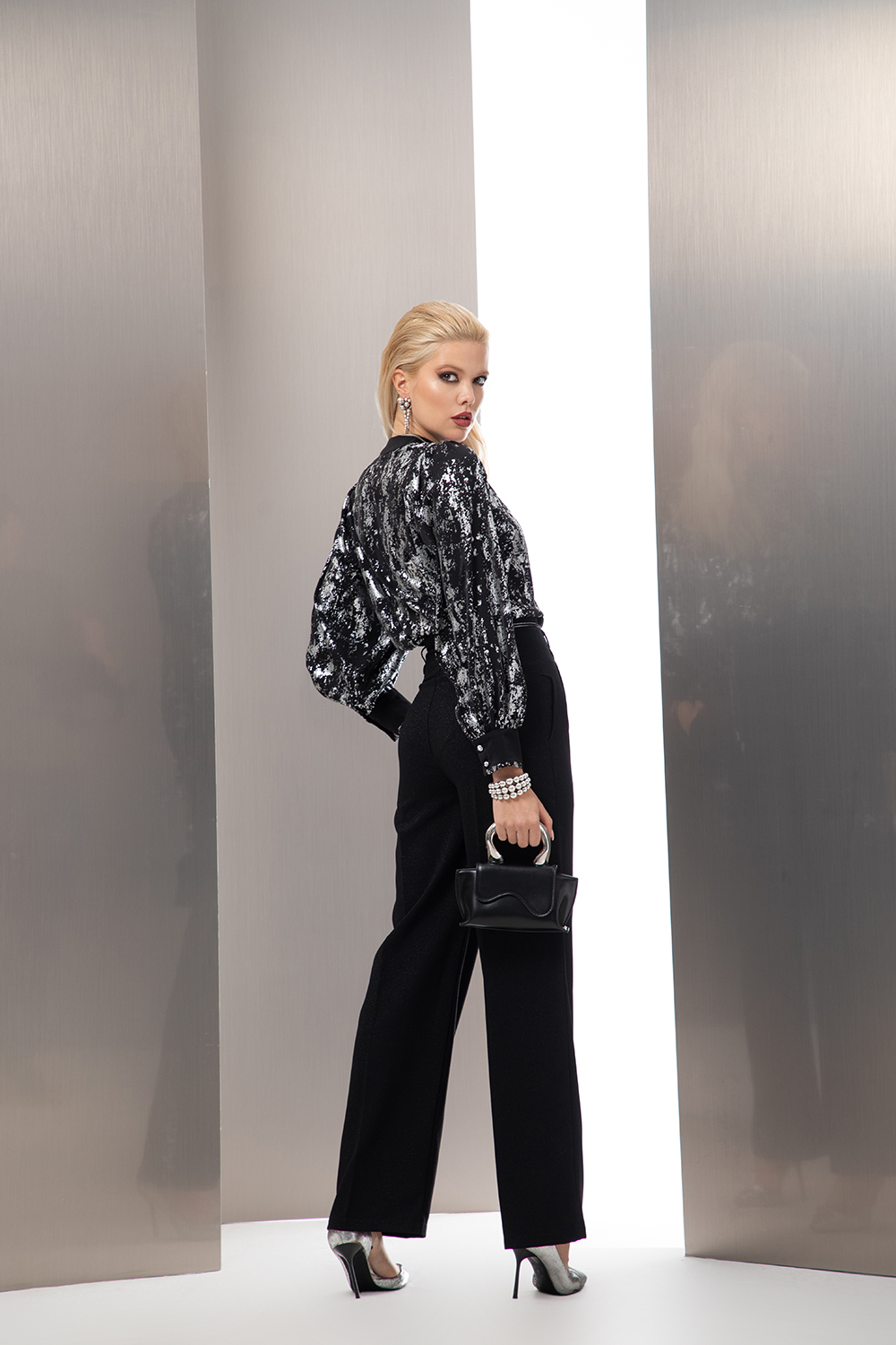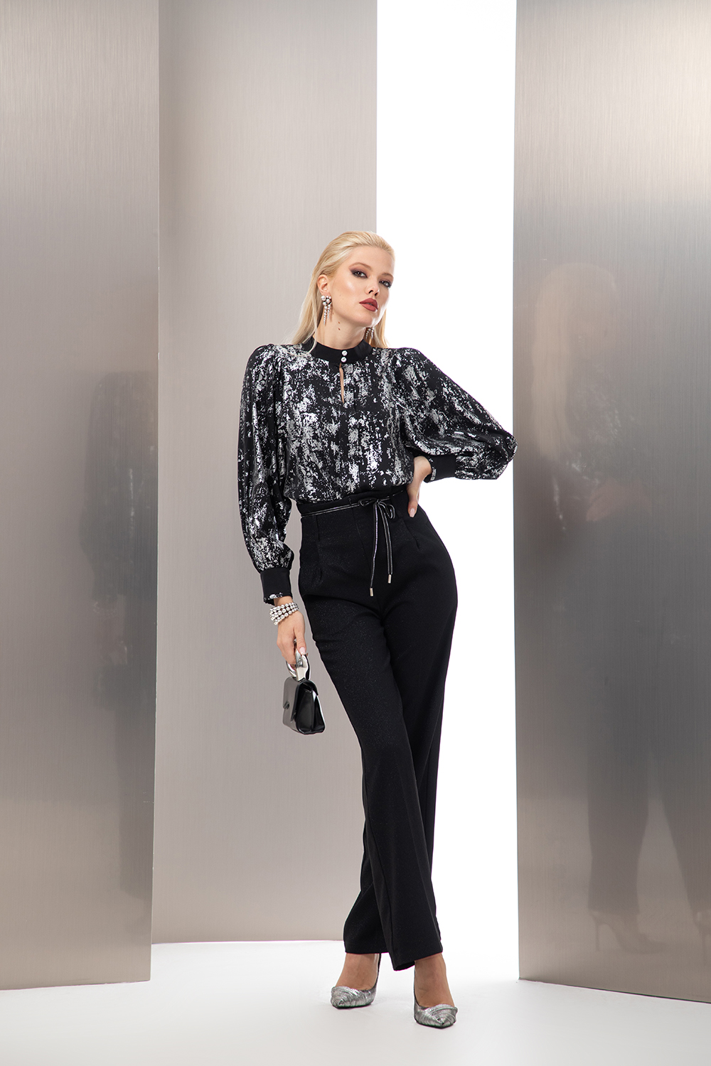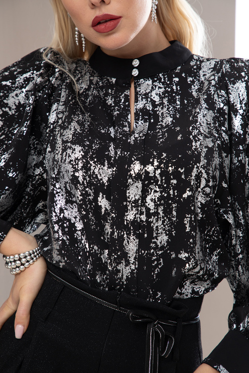 Елегантна риза с ефектен сребрист принт от лек шифон. Свободен силует с декоративен пластрон на предницата. Обла столче яка с предно закопчаване посредством две малки копченца и цепка. Дълъг обемен ръкав, завършен с маншет в черно.