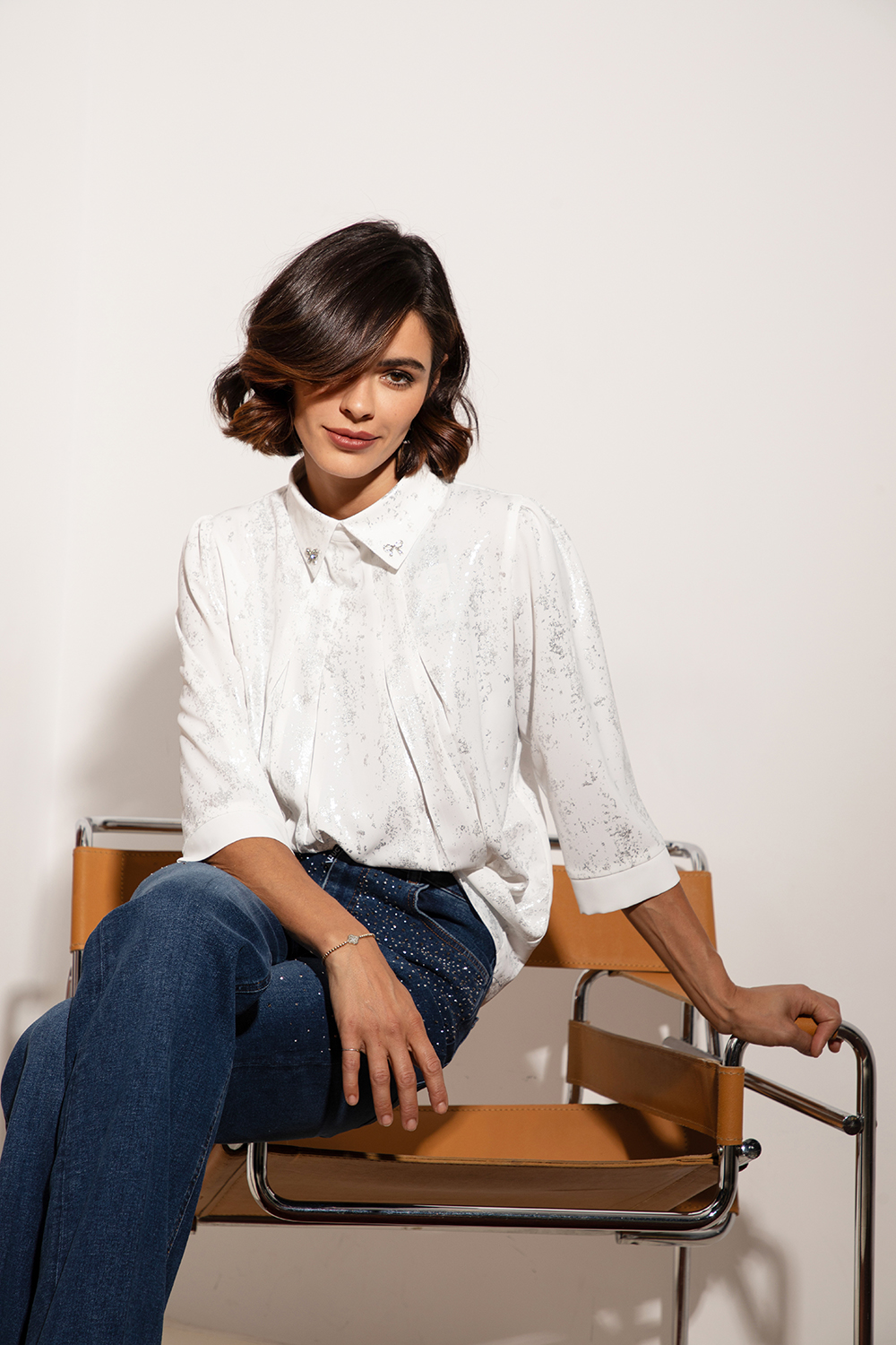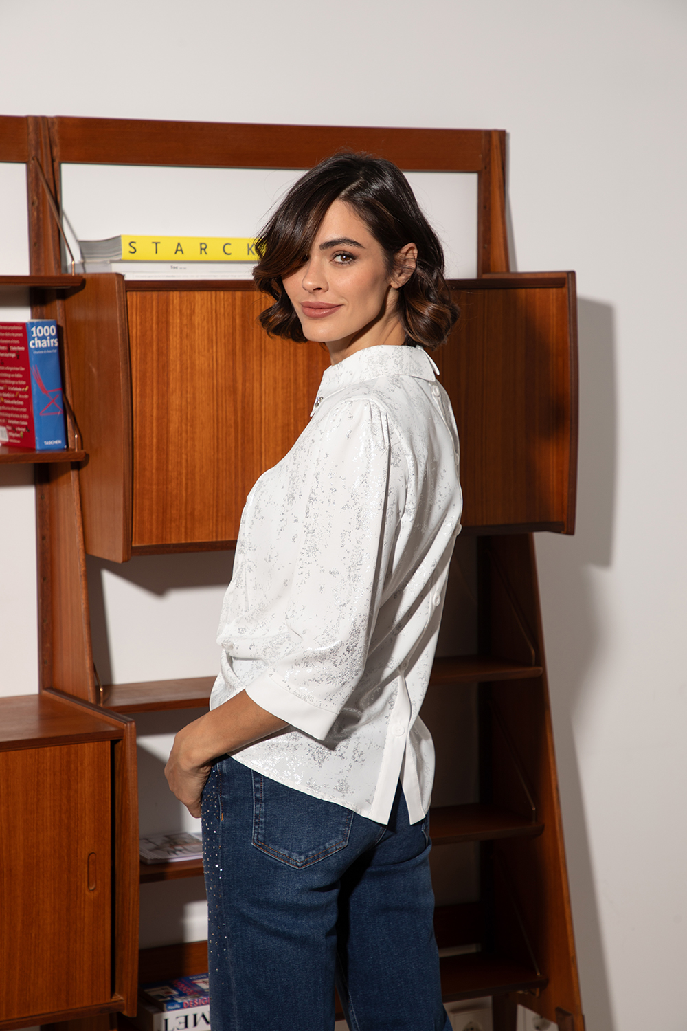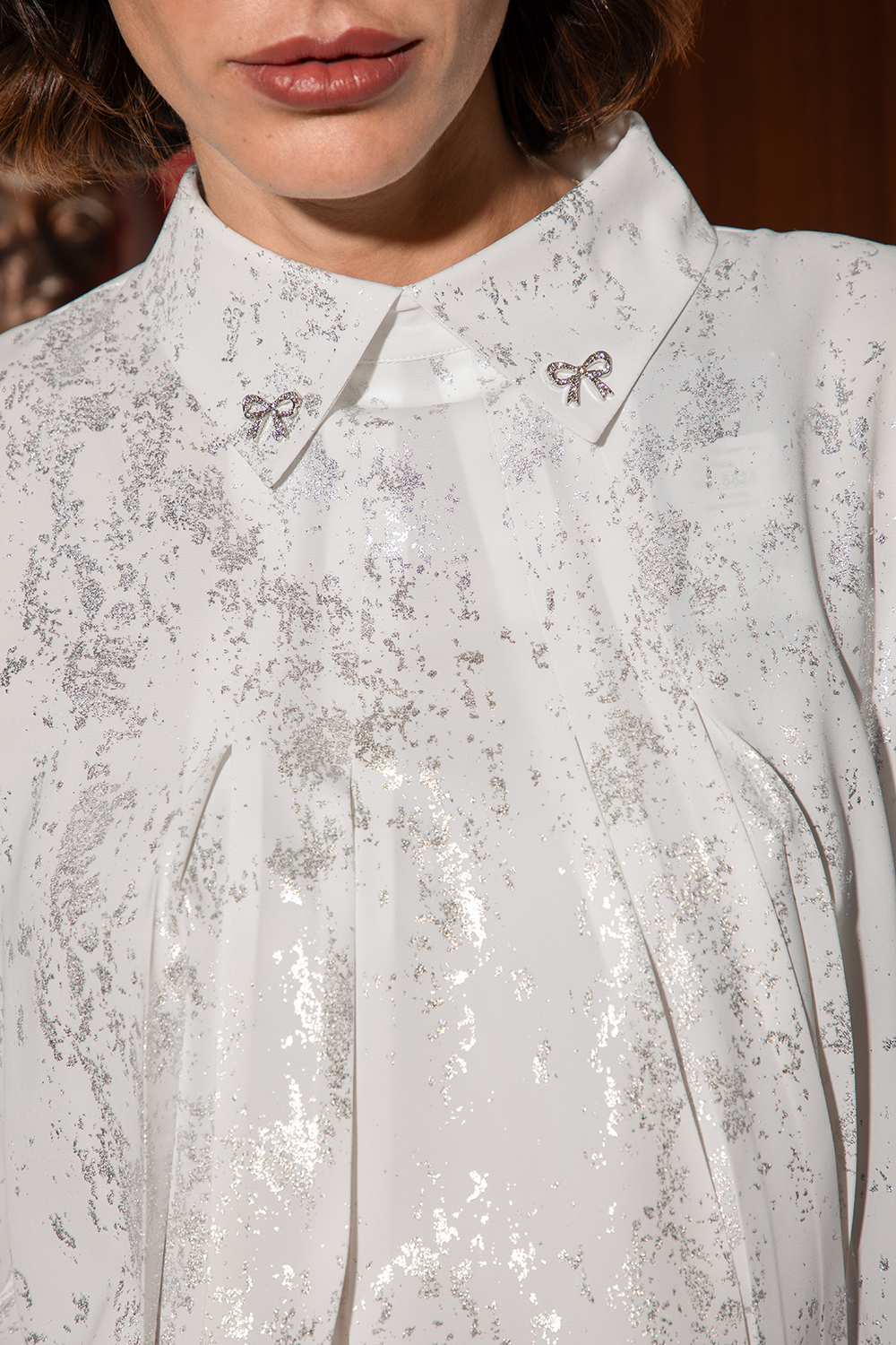 Елегантна риза от приятна лека материя с ефектен сребрист принт. Свободна линия със стилна якичка и чупки. Нестандартно закопчаване с пластон и копчета на гърба. 7/8 ръкав с маншет.