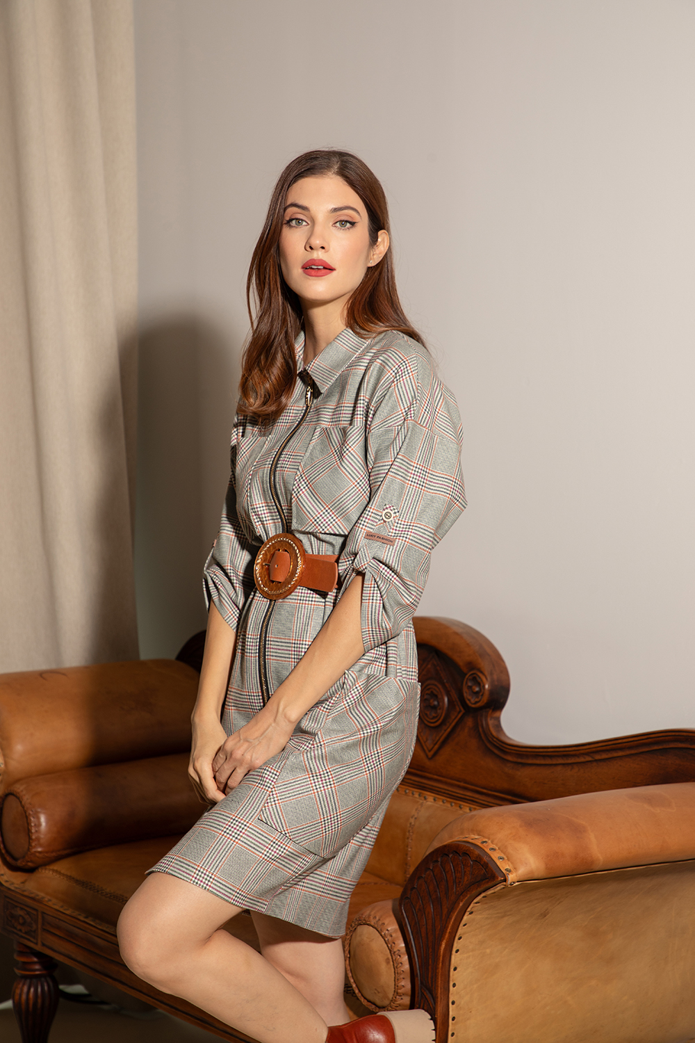 Спортно-елегантна рокля от приятна материя смес от вискоза и памук в нежно каре. Свободна линия с 7/8 ръкав тип "прилеп" с щрифелка. Яка, горни и долни външни джобове. Закопчаване посредством метален цип отпред.
