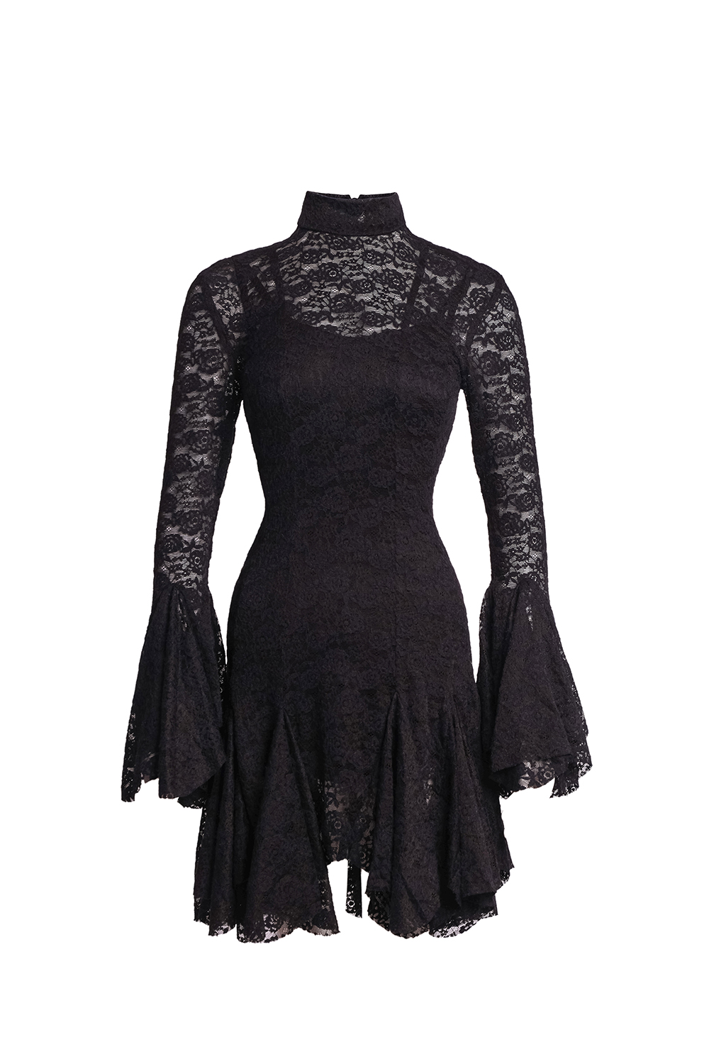 Елегантна рокля от красива черна дантела с еластан. Втален силует с разкроена долна част. Полу поло яка и дълъг ръкав с разкошни волани. Моделът се предлага с отделна подплата къс гащеризон от еластична материя в черно. Закопчаване посредством копче на гърба.