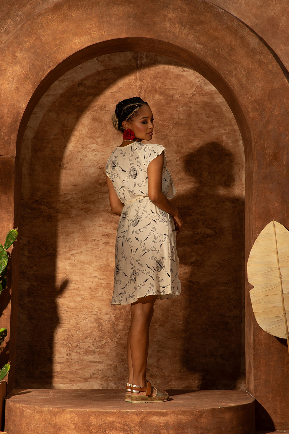 Кокетна рокля от фина и лека вискоза в светло екрю с нежен принт. Свободен силует с къдри по дължината на предницата и плохи на раменете. Моделът е с отделна подплата от еластична материя. Роклята се предлага с деликатно коланче от памучна дантела.