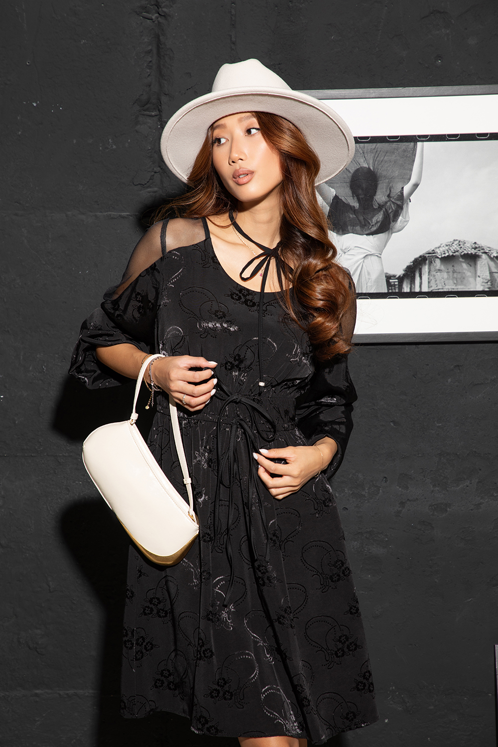 Елегантна рокля от красива вискоза в дискретен десен в черно. Леко свободен силует с разкроена долна част и ефектно вталяване посредством двоен ластик в талията. Обло деколте и дълъг ръкав с платки от тюл на раменете.