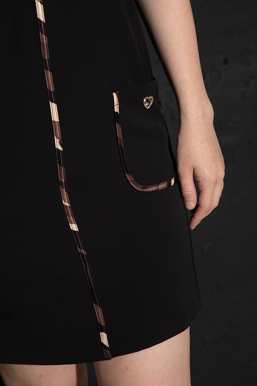 Спортно-елегантна рокля в черно от приятна еластична материя в черно Леко свободен силует с обло деколте. Къс ръкав и два външни джоба обточени с цветно бие. Закопчаване посредством цип и копче на гърба.