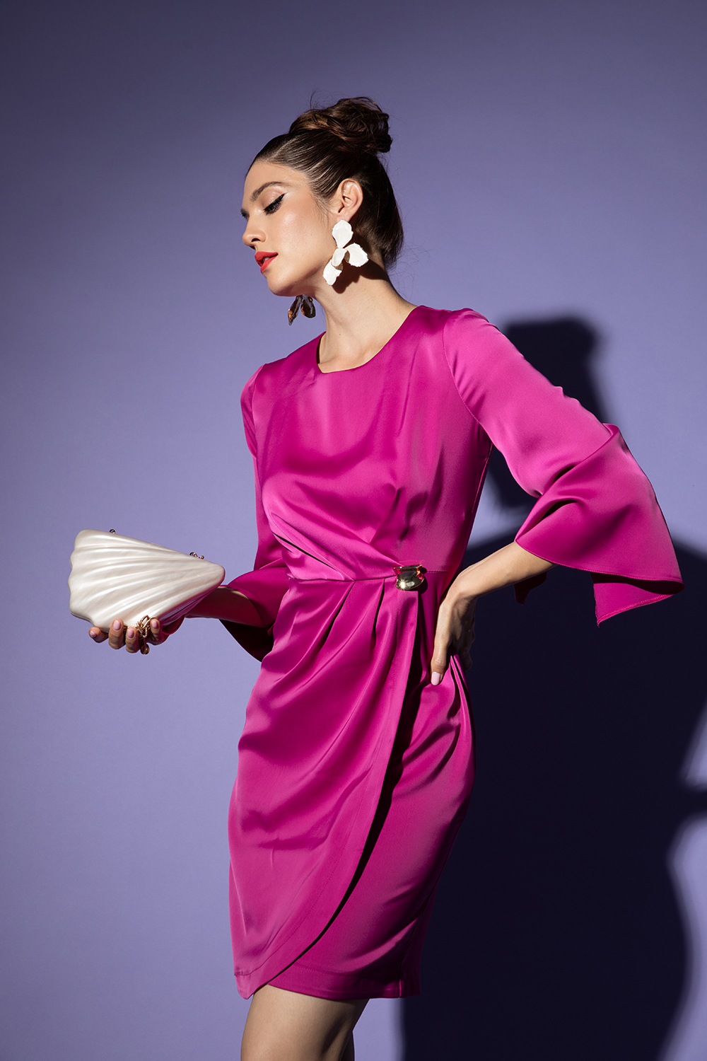 Елегантна рокля от приятна сатенирана материя в цвят фуксия. Леко втален силует с интересна асиметрична кройка. Набор и прехвърляне в долната част, красиво бижу в талията. 7/8 ефектен разкроен ръкав с цепка. Закопчаване посредством цип и копче на гърба.