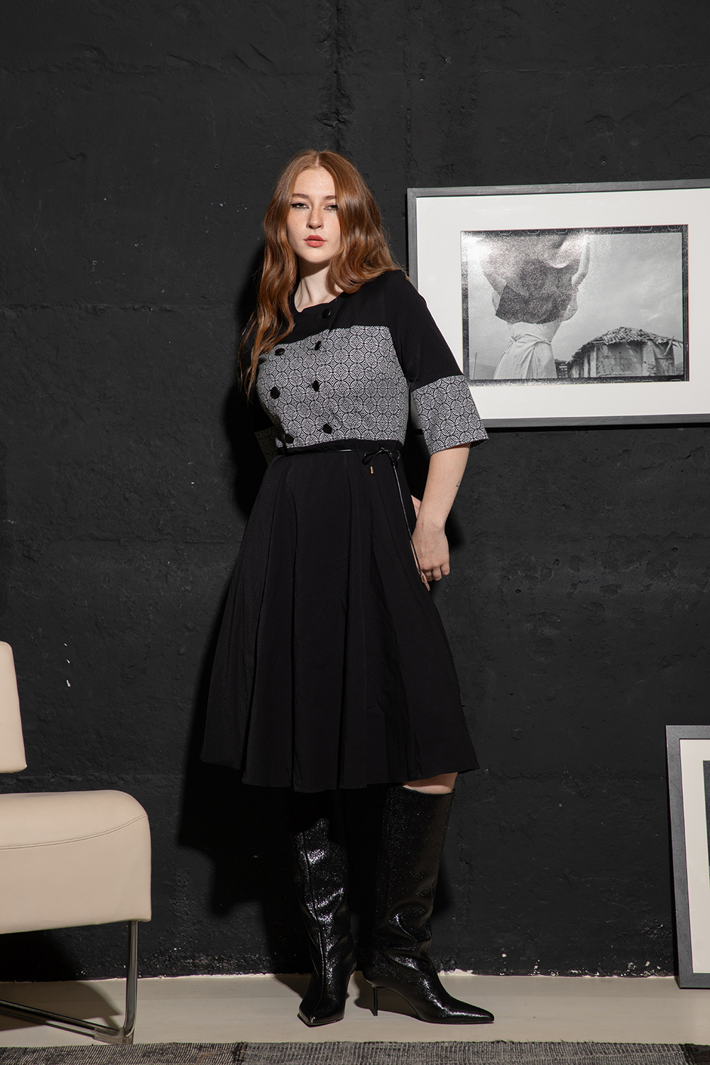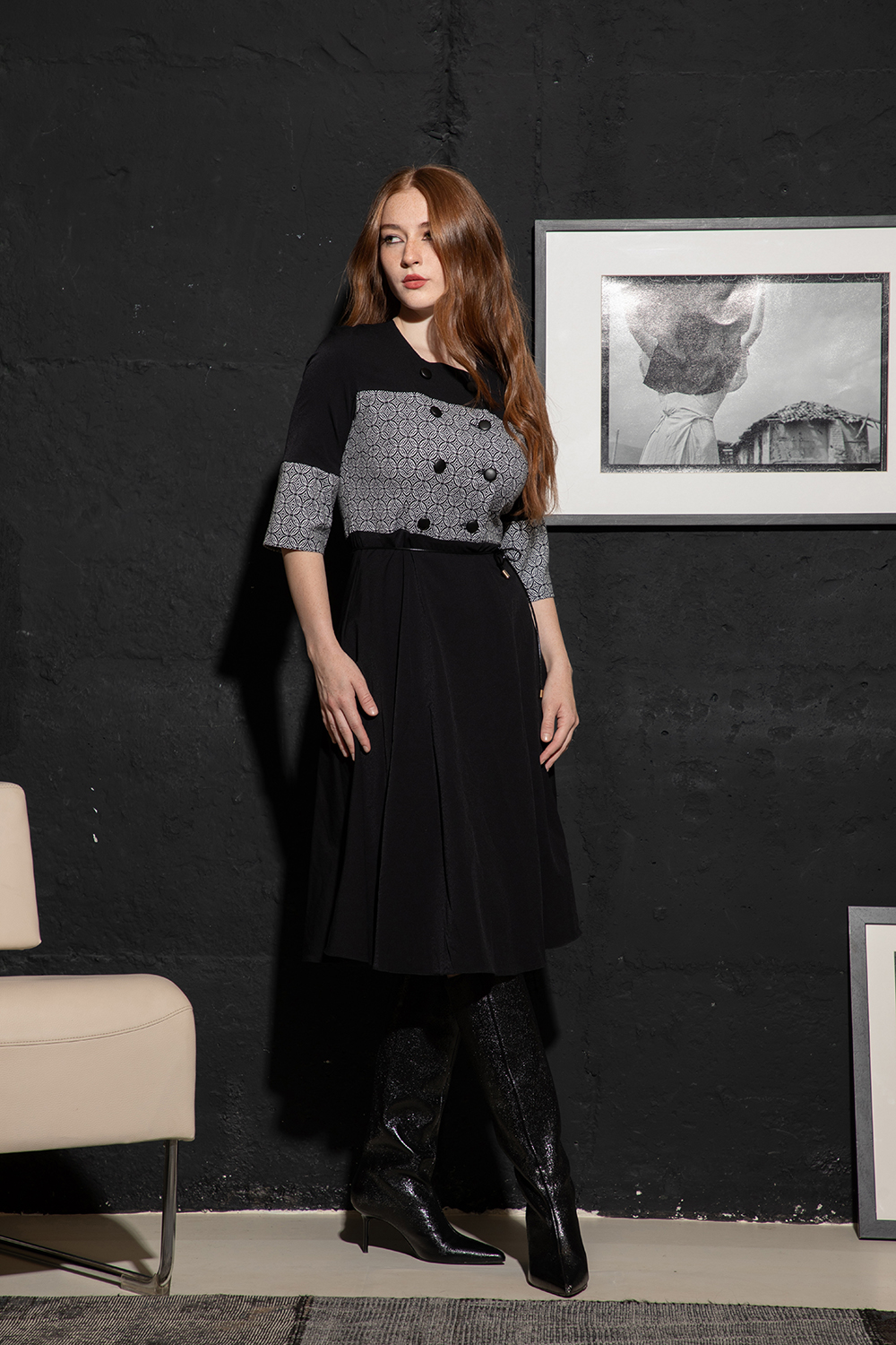Елегантна рокля от приятна материя със съдържание на вискоза и памук, в комбинация от черно и сиво. Втален силует в миди дължина и разкроена долна част. Горната част е с двуредни копчета и обло деколте, 7/8 ръкав с широк маншет. Закопчаване посредством златист цип на гърба.