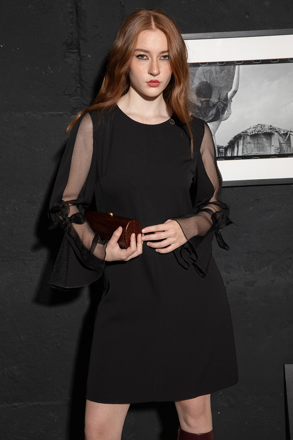 Елегантна и стилна рокля в черно от приятна еластична материя в черно. Свободен силует с обло деколте и дълъг ефектен ръкав с органза и панделки. Закопчаване посредством цип, цепка и копче на гърба.