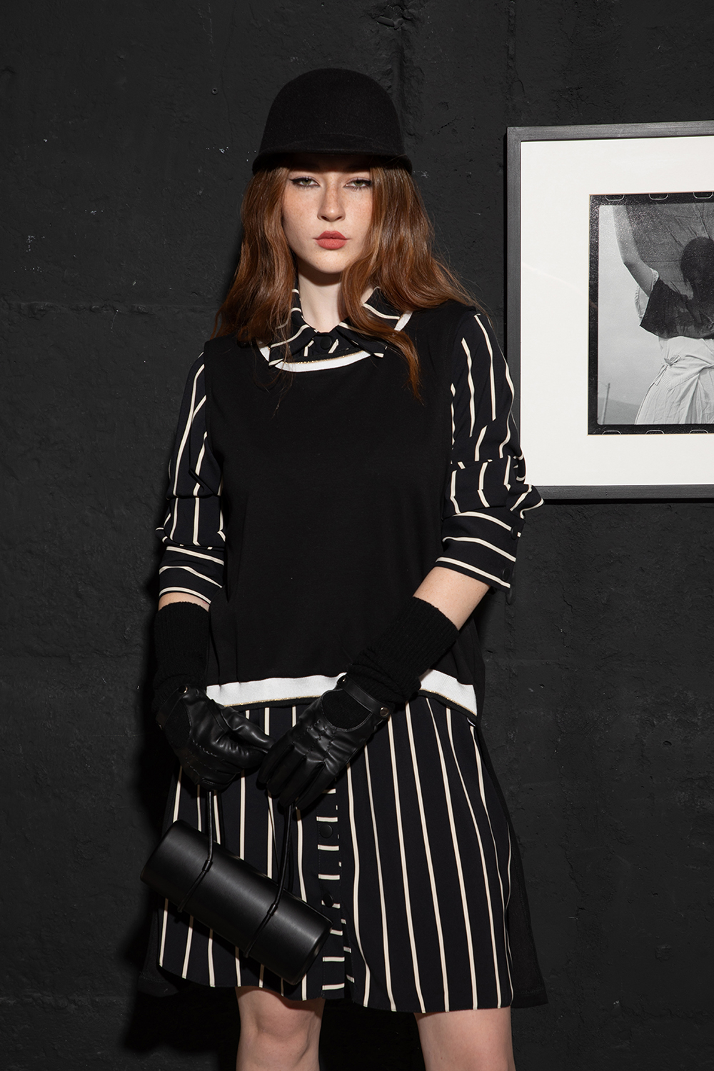 Елегантна и интересна рокля от две части в черно с бяло райе. Долната част е рокля тип риза от лека вискоза със свободна кройка. Предно закопчаване посредством пластрон с копчета и яка. 3/4 ръкав с маншет. Горната част е тип блуза без ръкав от приятно еластично трико в черно. Свободен силует с обло деколте и бял шрик по деколтето и подгъва. Издължена задна част с цепка.