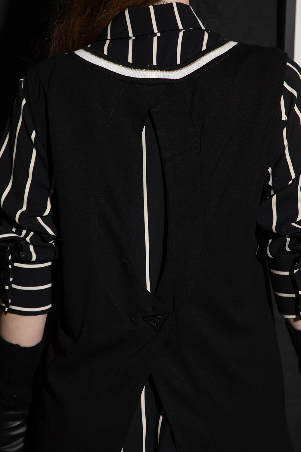 Елегантна и интересна рокля от две части в черно с бяло райе. Долната част е рокля тип риза от лека вискоза със свободна кройка. Предно закопчаване посредством пластрон с копчета и яка. 3/4 ръкав с маншет. Горната част е тип блуза без ръкав от приятно еластично трико в черно. Свободен силует с обло деколте и бял шрик по деколтето и подгъва. Издължена задна част с цепка.