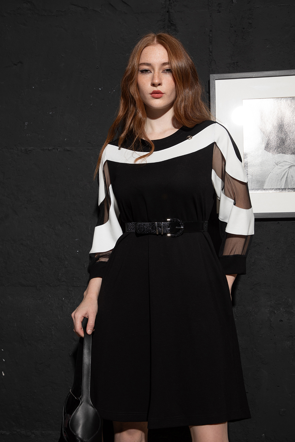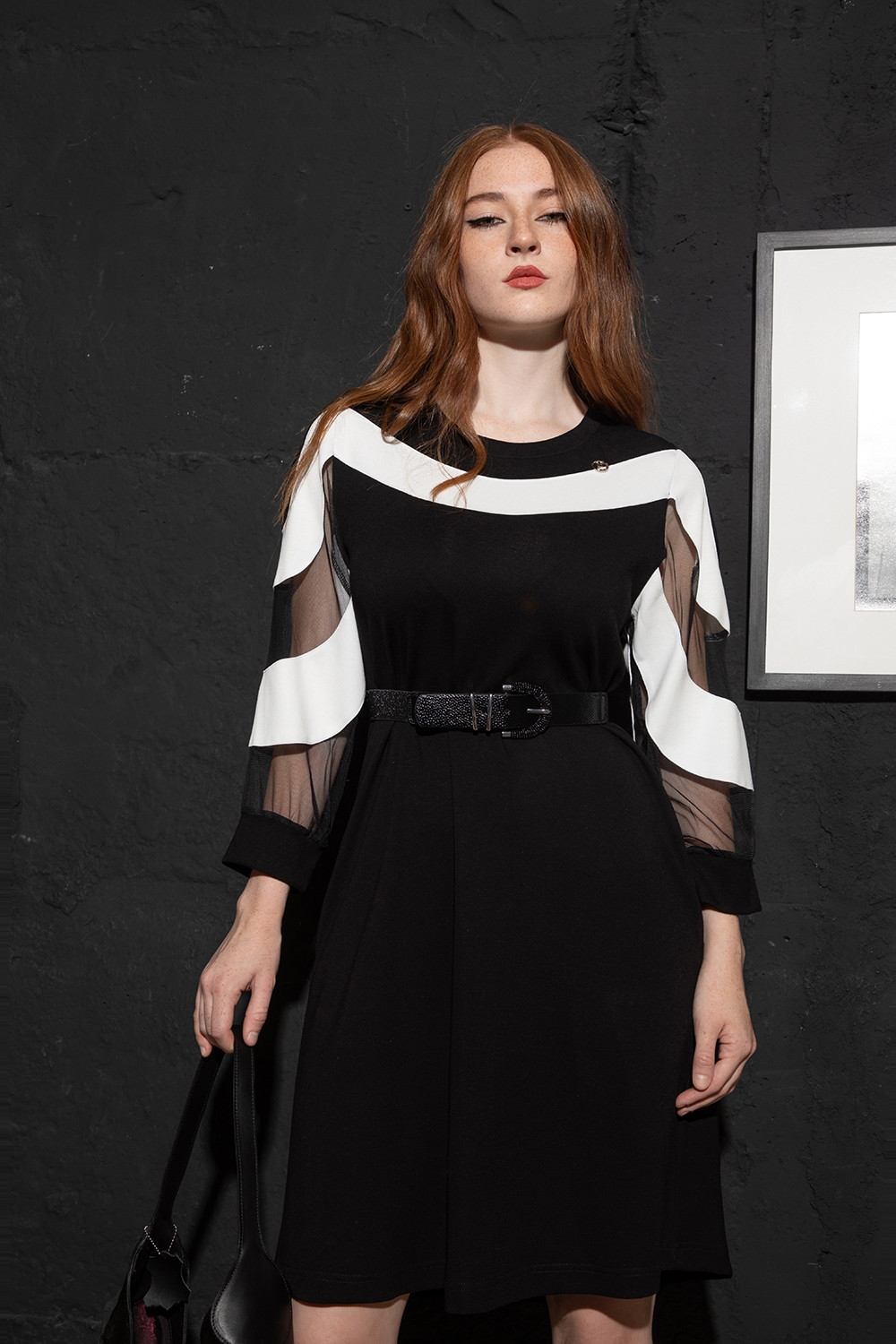 Елегантна и ефектна рокля от приятна еластична материя в черно и бяло. Леко втален силует с интересни вълнообразни детайли, който преминават към ръкавите. 7/8 ръкав, комбиниран с тюл и маншет.