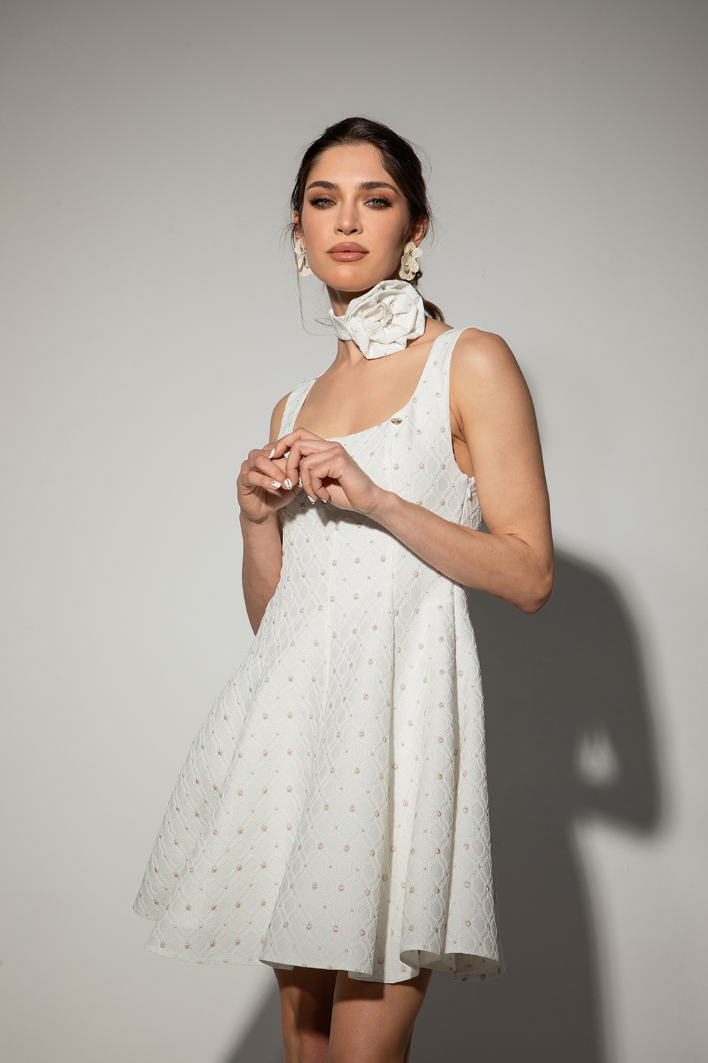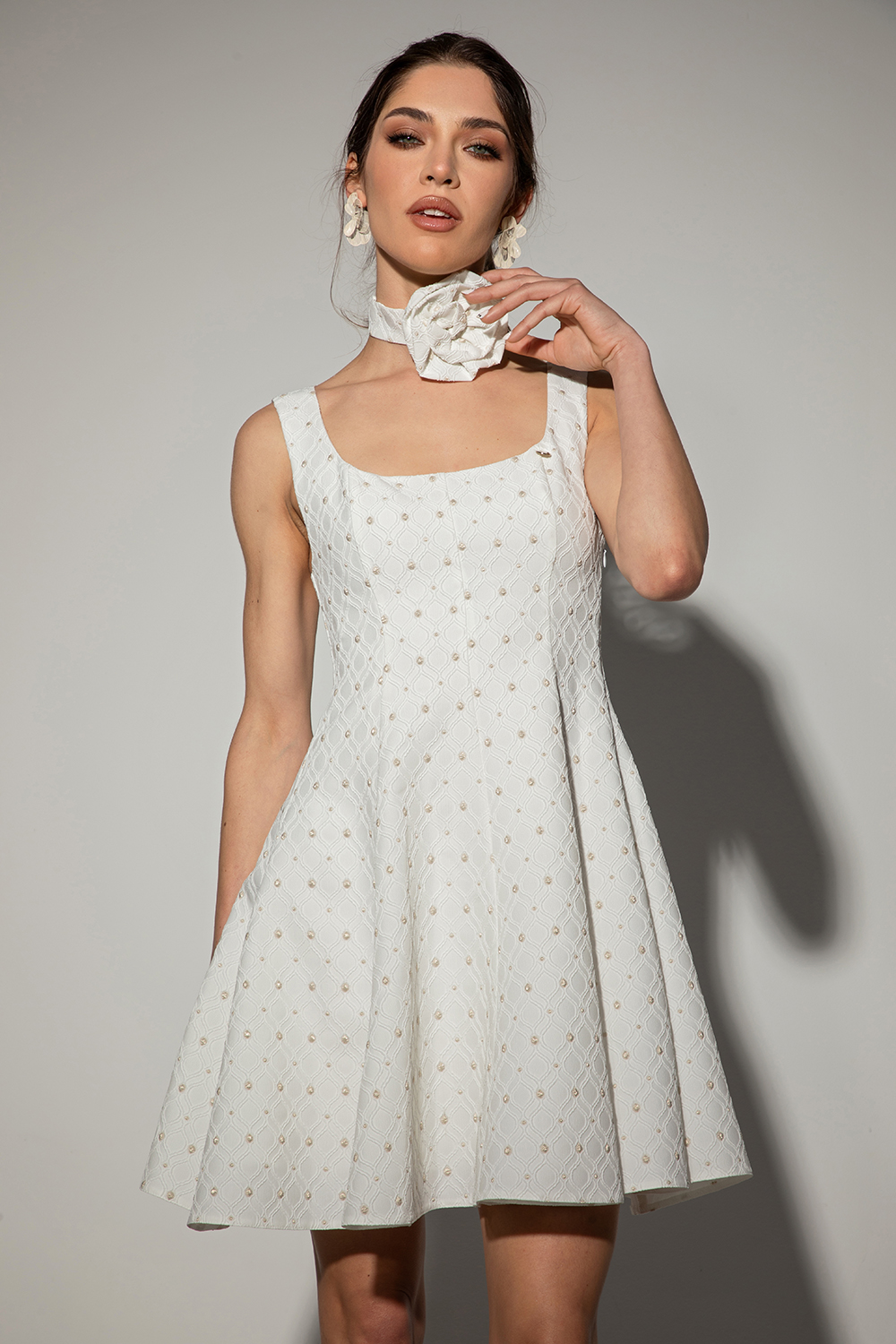 Елегантна рокля в светло шампанско със златисти точици. Изработена е от релефна жакардова материя. Втален силует с разкроена долна част. Овално деколте и странично закопчаване посредством скрит цип. Роклята е изработена със сатенирана подплата.