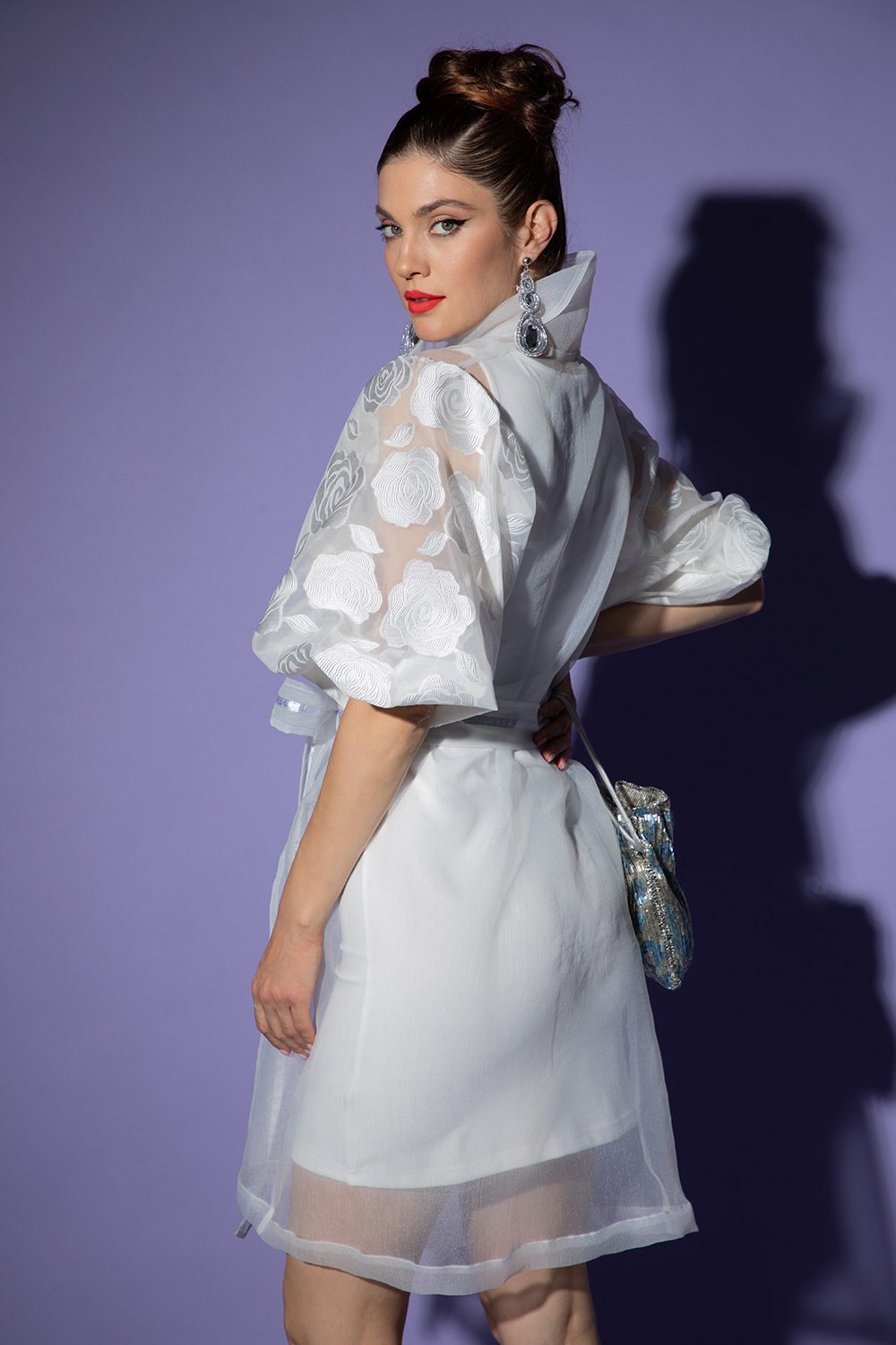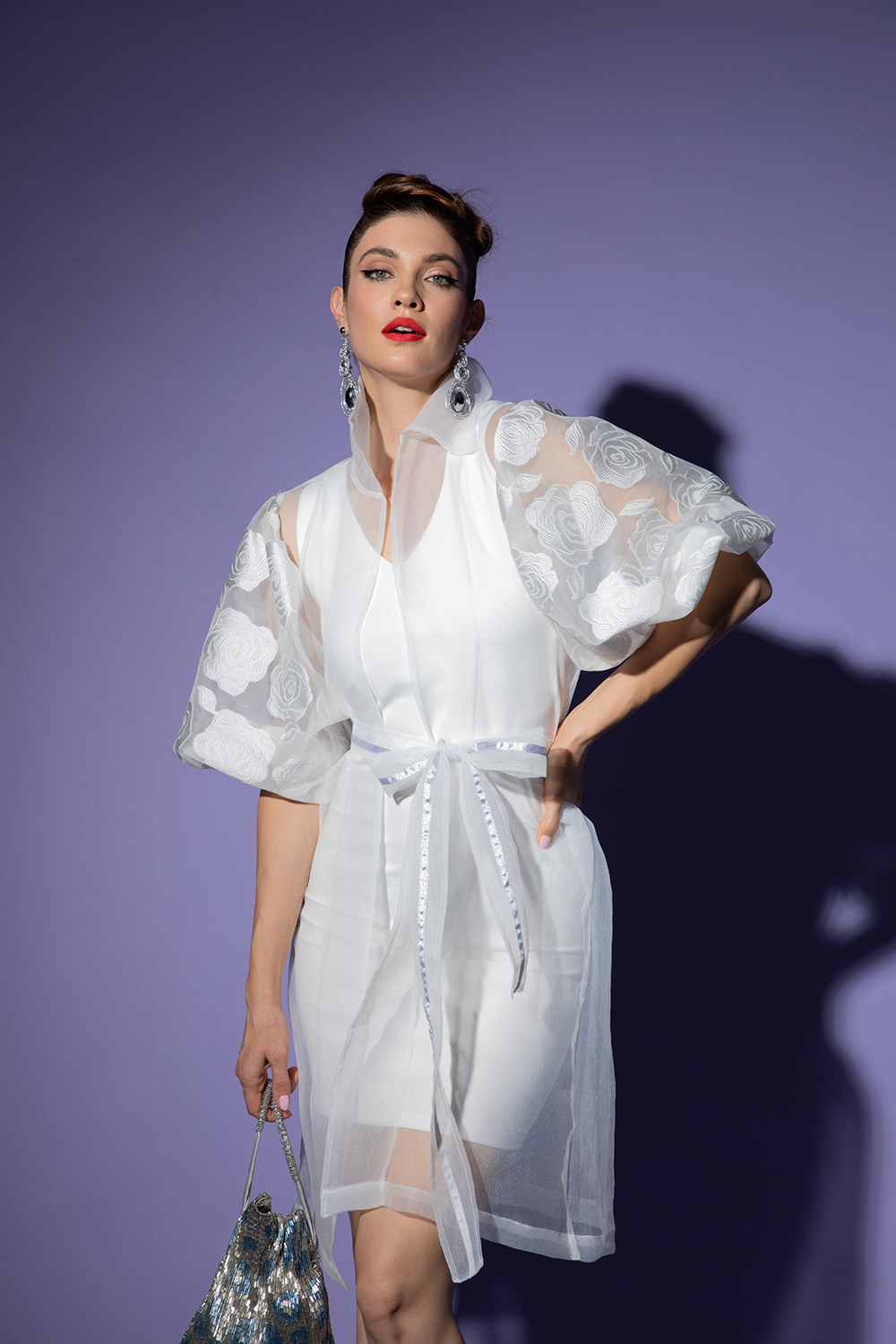 Елегантна рокля от нежна лека органза в нежно бяло. Свободен силует без закопчаване, подвижен колан от същата материя и сребриста лента. Яка и 7/8 богати ръкави с ефектен флорален мотив. Моделът се предлага с вталена еластичена рокля от приятна материя в същия цвят.