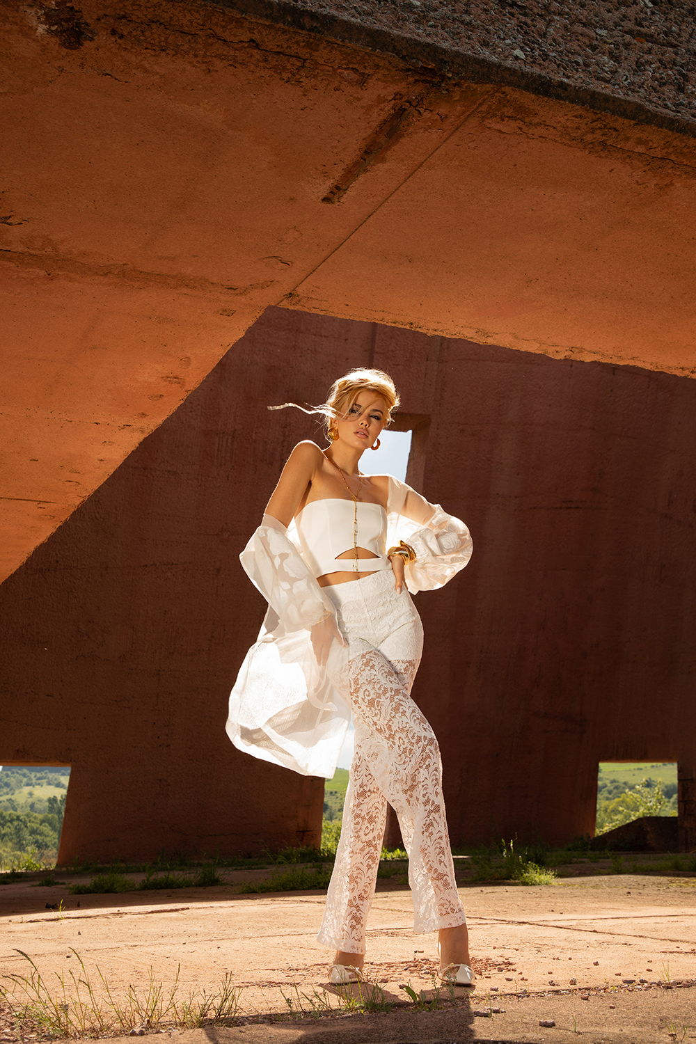 Елегантна рокля от нежна лека органза в нежно бяло. Свободен силует без закопчаване, подвижен колан от същата материя и сребриста лента. Яка и 7/8 богати ръкави с ефектен флорален мотив. Моделът се предлага с вталена еластичена рокля от приятна материя в същия цвят.