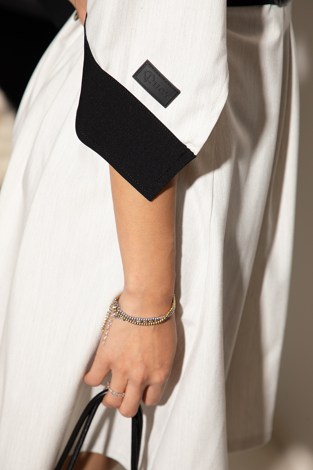 Елегантна рокля от приятна материя със съдържание на памук и вискоза в комбинация на черно и светло сиво. Леко свободен силует с вталяване посредством плохи и разкроена долна част. Интересно V-образно деколте с прикачен детайл като риза с копчета и яка. 3/4 ръкав с авангарден маншет. Предно закопчаване с копчета.