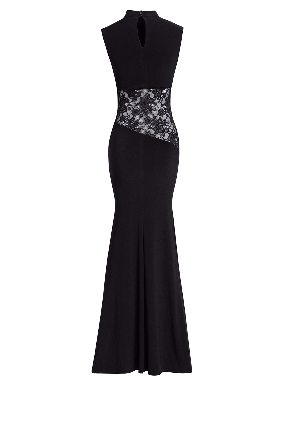Елегантна дълга рокля в черно от приятна еластична материя, комбинирана с дантела. Втален силует с полу поло яка. Ефектна асиметрична платка в талията от кравива дантела. Закопчаване посредством две копчета на гърба.