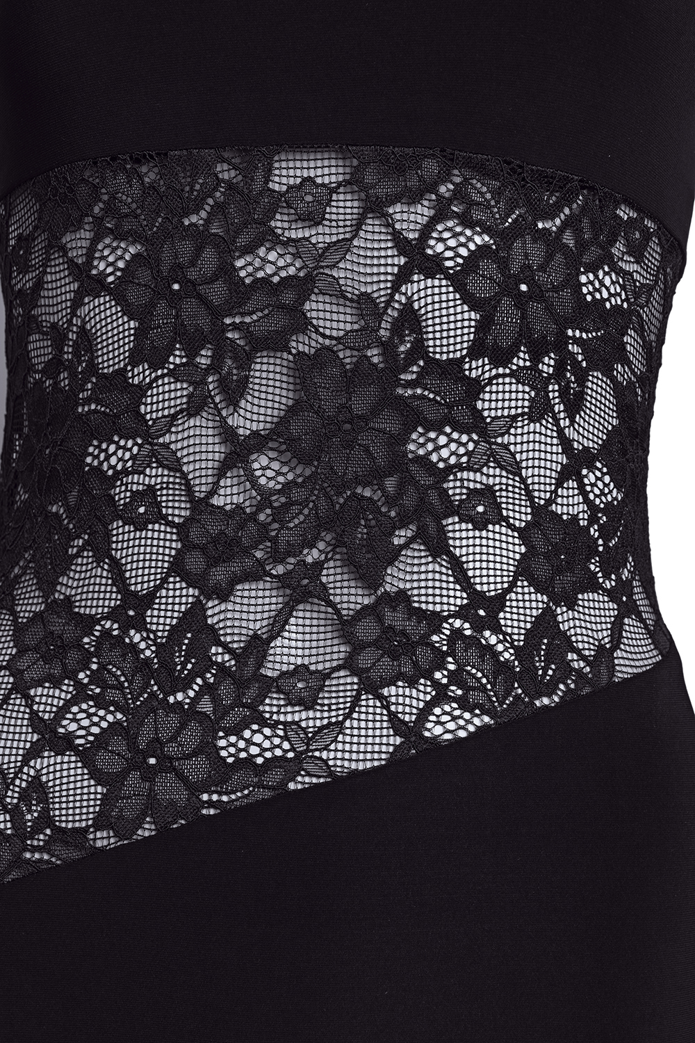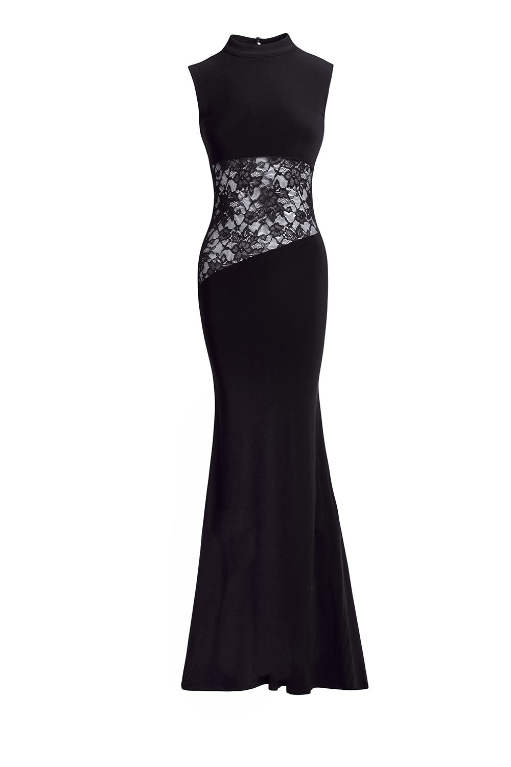 Елегантна дълга рокля в черно от приятна еластична материя, комбинирана с дантела. Втален силует с полу поло яка. Ефектна асиметрична платка в талията от кравива дантела. Закопчаване посредством две копчета на гърба.
