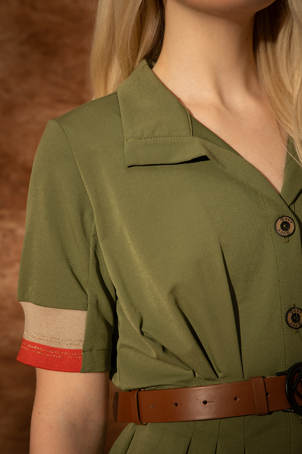Спортно-елегантна рокля във войнишко зелено от приятна еластична материя. Леко втален силует посредством плохи в талията и разкрояване в долната част. Яка и закопчаване посредством копчета на предницата. Къс ръкав с цветен щрик.