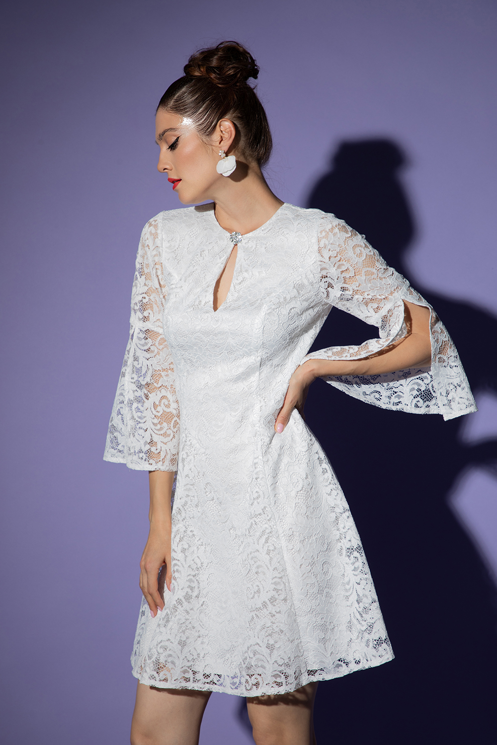 Елегантна рокля в бяло от ефектна дантела. Втален А-силует с разкрояване в долната част. Обло деколте с отвор отпред и панделка на гърба. 7/8 разкроен ръкав с цепка и задно закопчаване посредством цип. Моделът е изработен с еластична подплата.